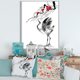 Designart "Japanese Cranes Bird Drawing With Red Flowers" Traditional Framed Canvas Wall Art Print