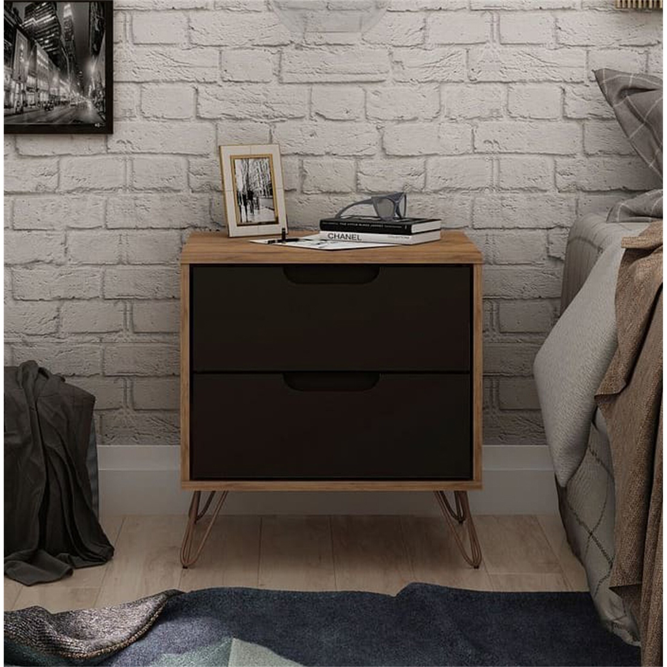 Mid-Century Modern Nightstand with 2 Drawer Nature and Textured Grey