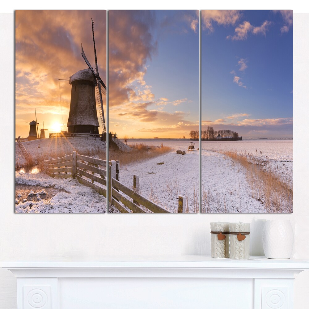 Designart "Dutch Windmills at Sunrise" Large Glossy Canvas Art Print