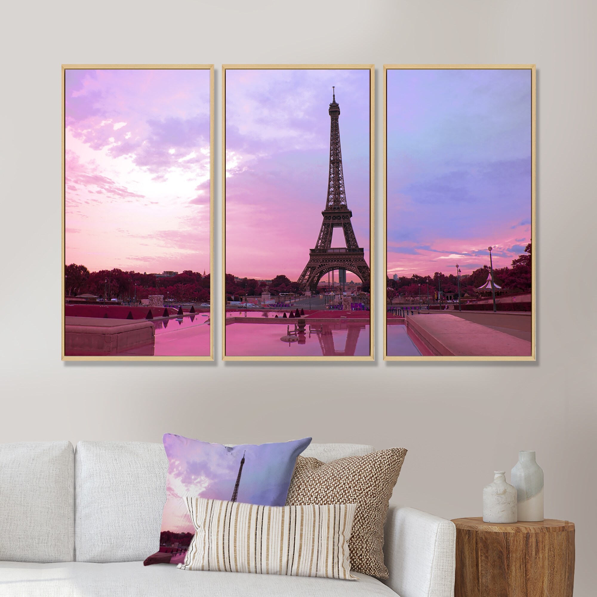 Designart "Paris Eiffel Towerin Purple Tone" Landscape Framed Art Prints Set of 3 - 4 Colors of Frames