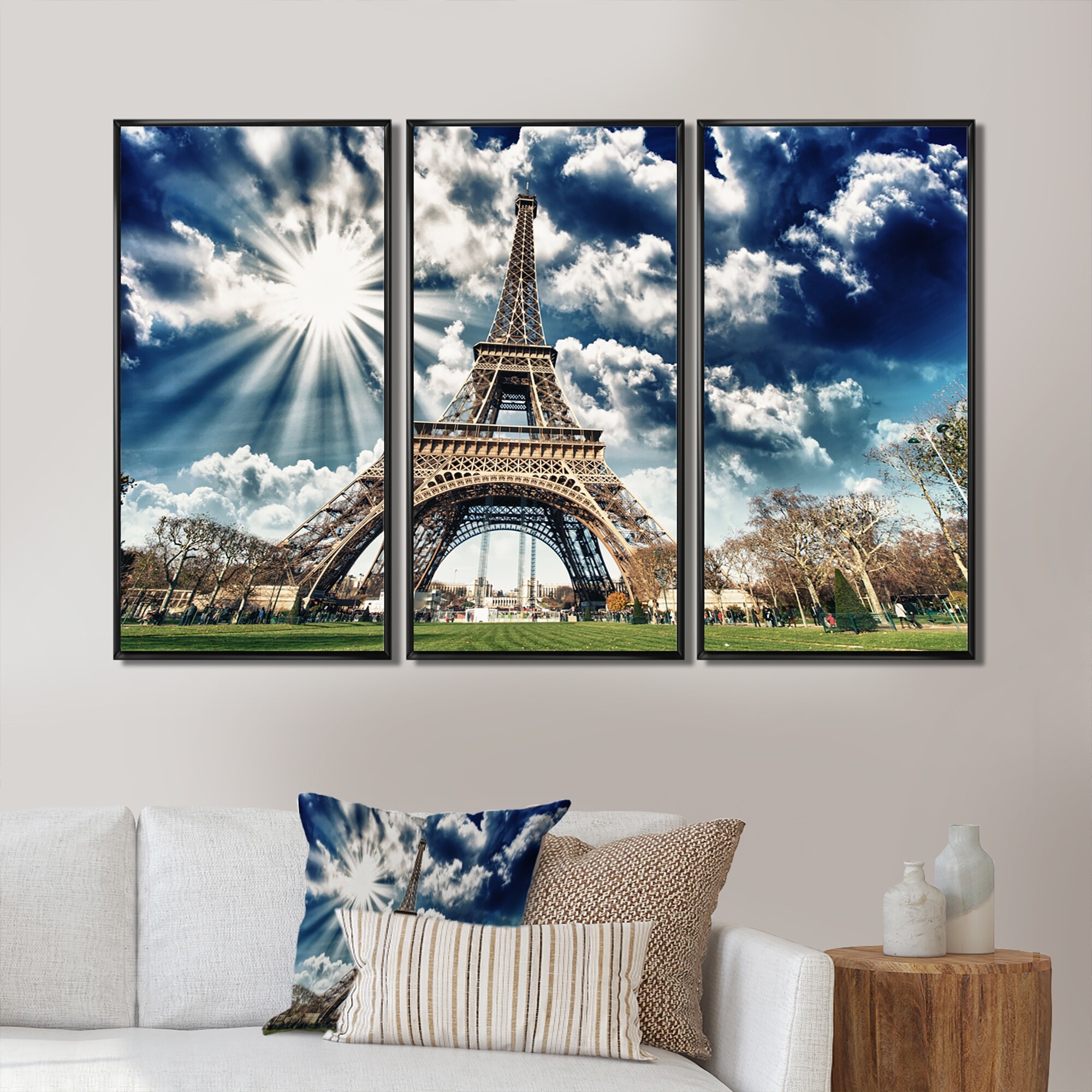 Designart "Beautiful View of Paris Paris Eiffel Towerunder Dark Sky" Cityscape Framed Canvas Wall Art Print - 3 Panels