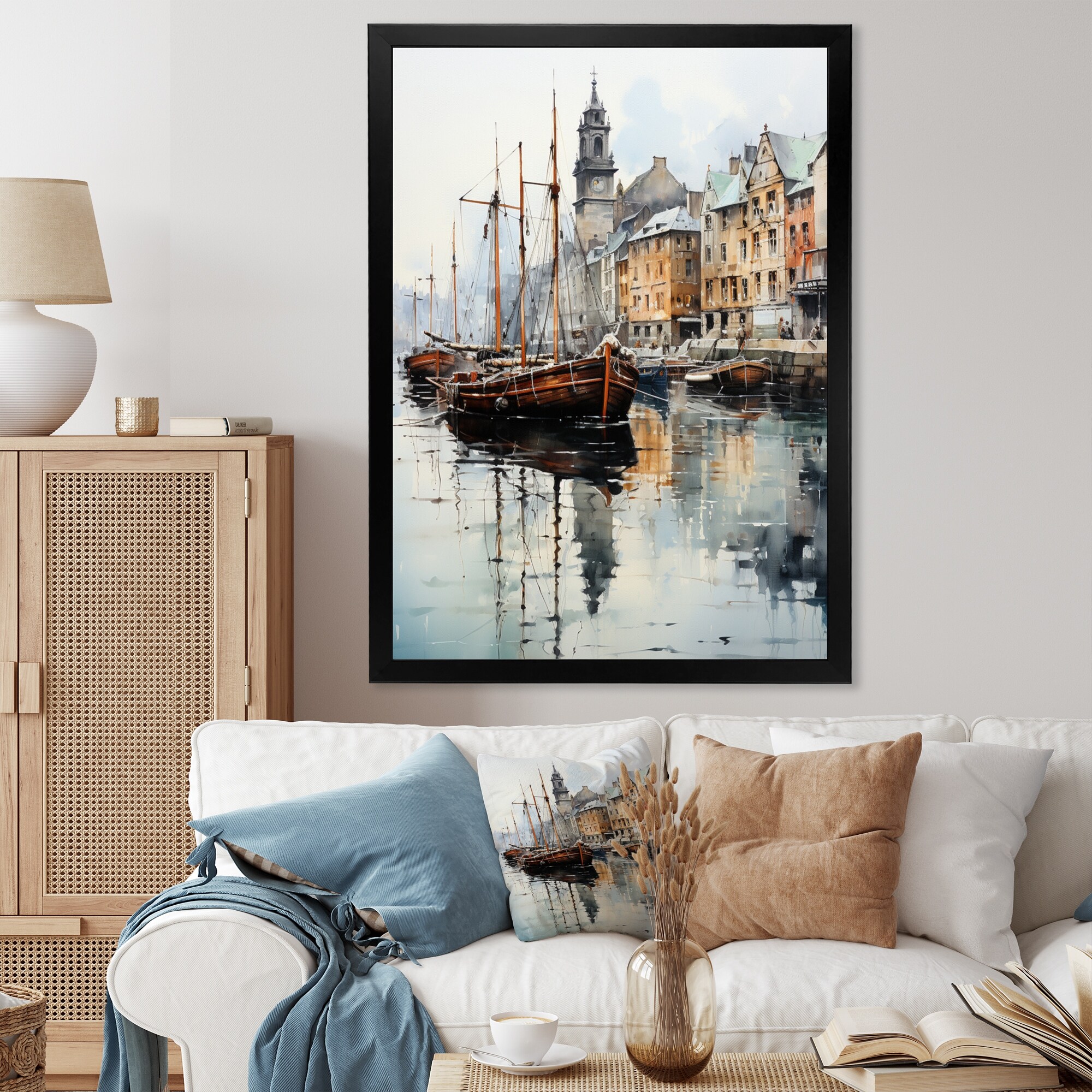 Designart "England Misty Harbor Townengland" England Framed Canvas Wall Art