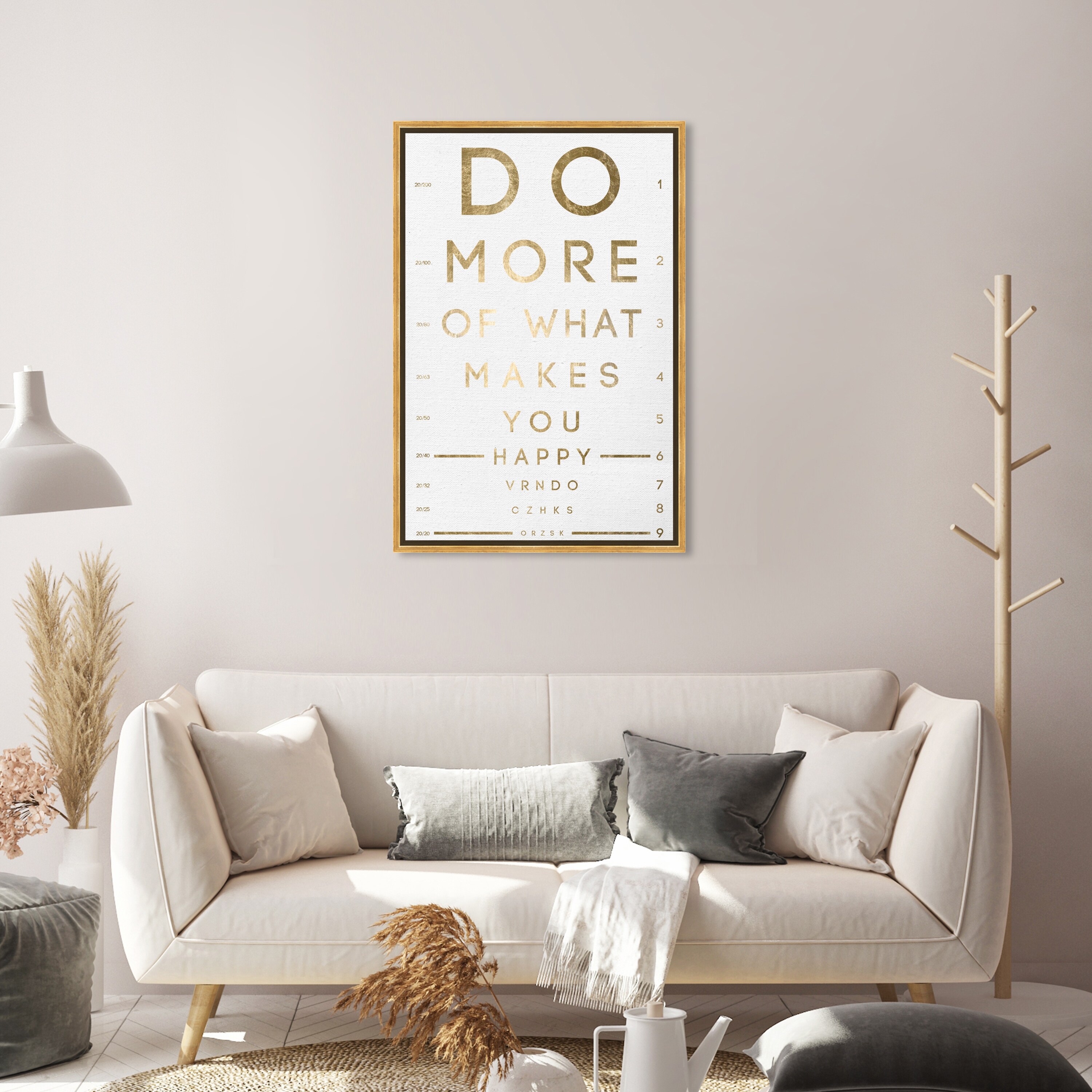 Oliver Gal 'White Be Happy Eye Chart in Gold' Typography and Quotes Wall Art Framed Canvas Print Motivational - Gold, White