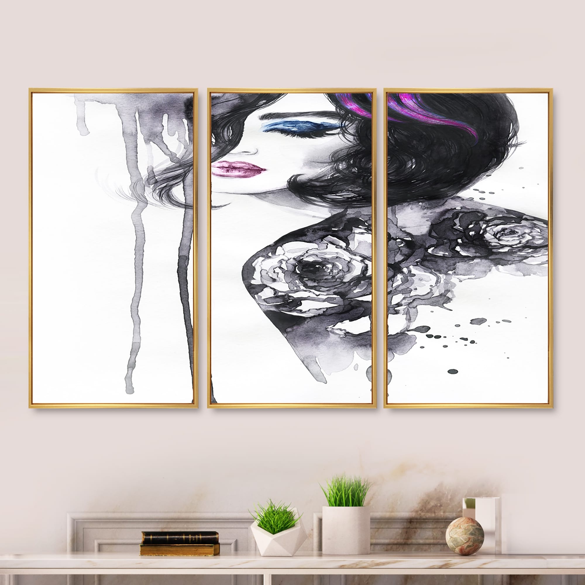 Designart "Painting Female Portrait" Modern Framed Canvas Wall Art Set of 3 - 4 Colors of Frames