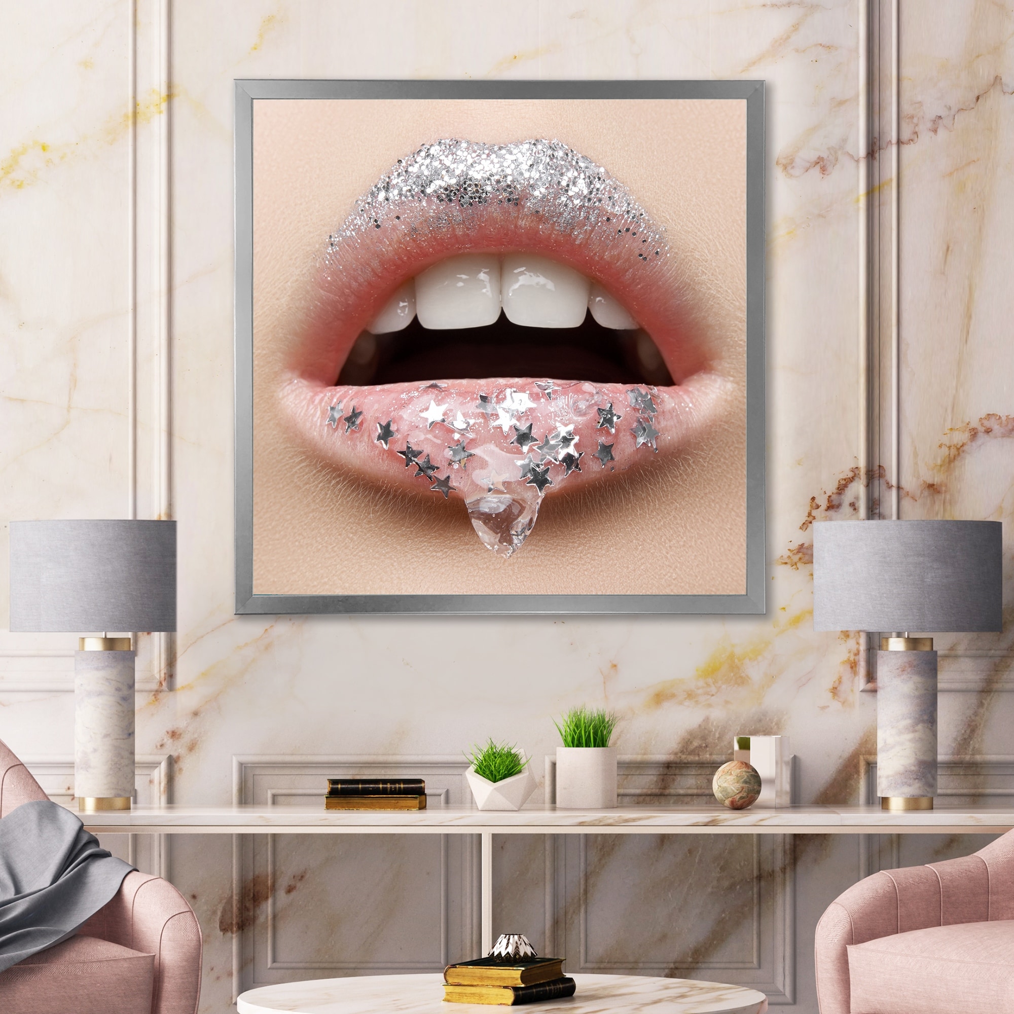 Designart "Female Lips With A Gel on the Lips & Stars" Modern Framed Art Print