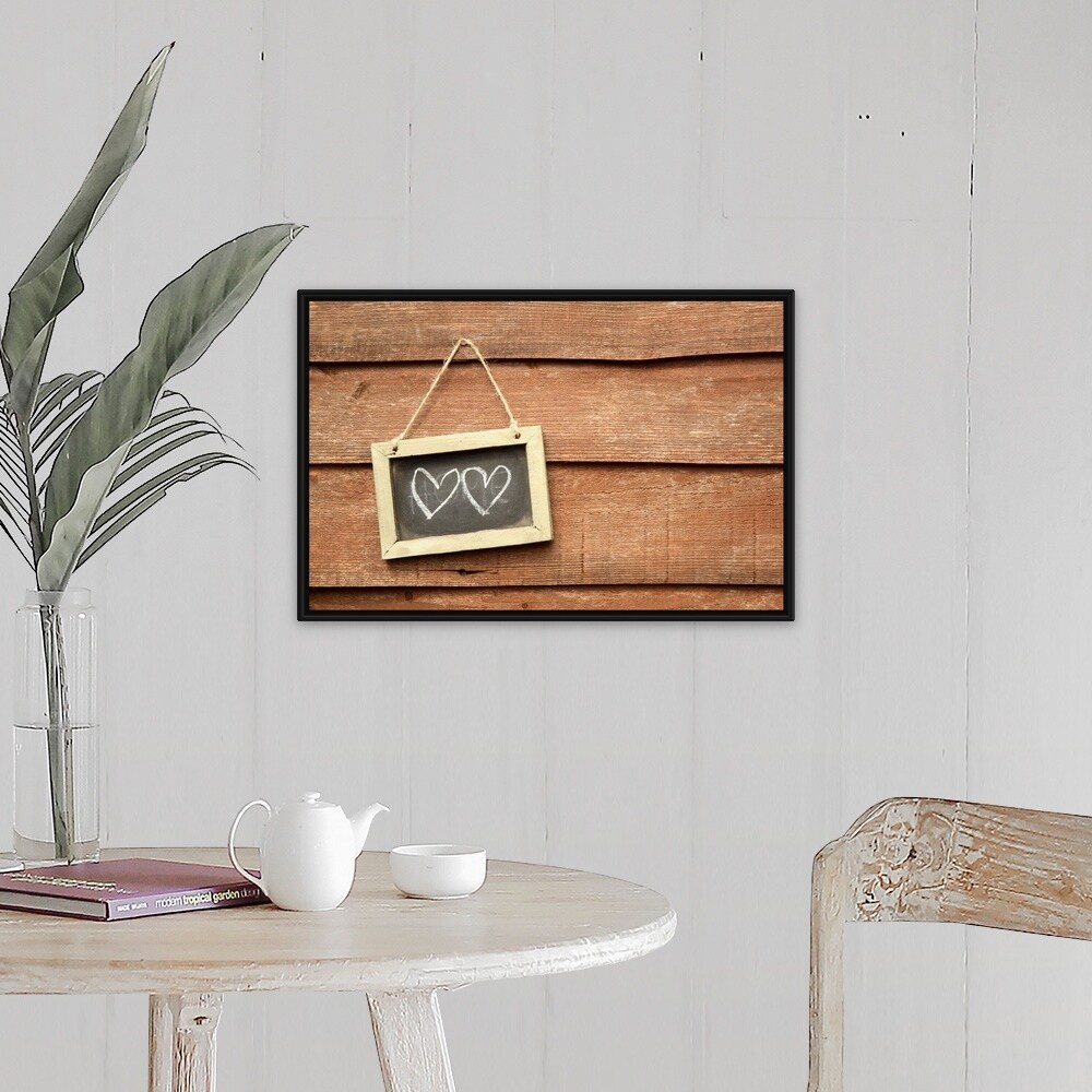 "Two hearts drawn on small blackboard on garden fence" Black Float Frame Canvas Art