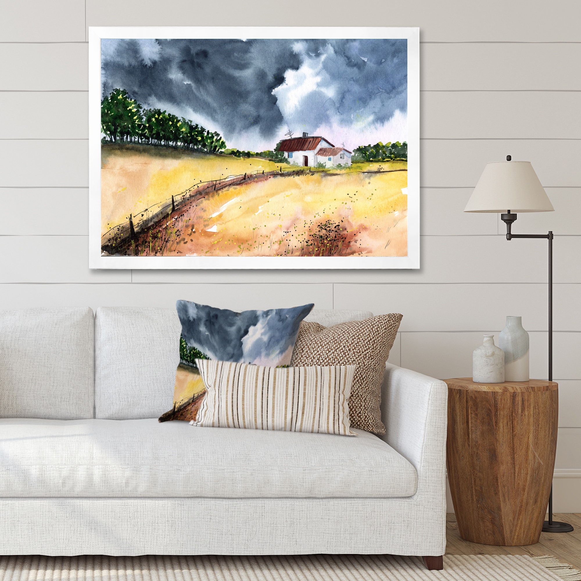 Designart "Yellow Field With Trees A Small Fence, Farmhouses" Country Framed Art Print