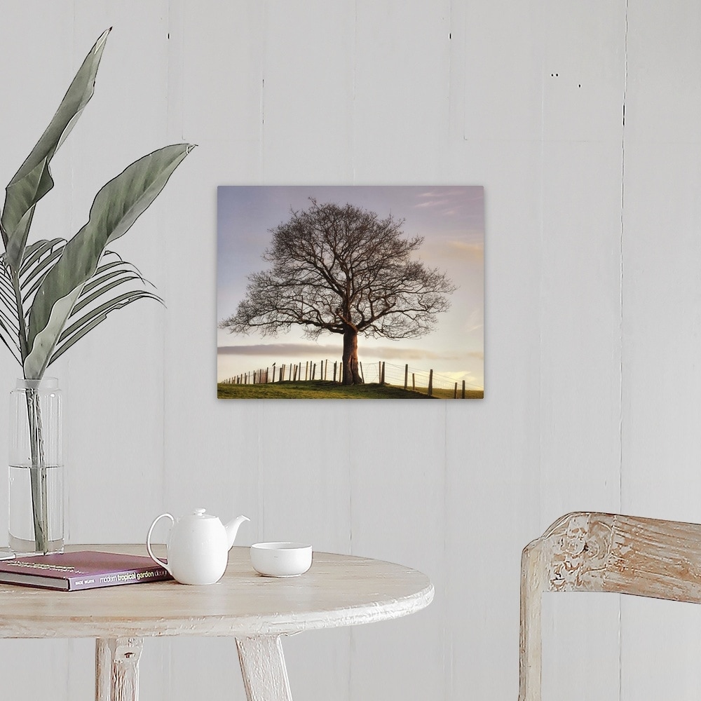 "Large tree in center of fence with bird sitting on fence at sunset." Canvas Wall Art