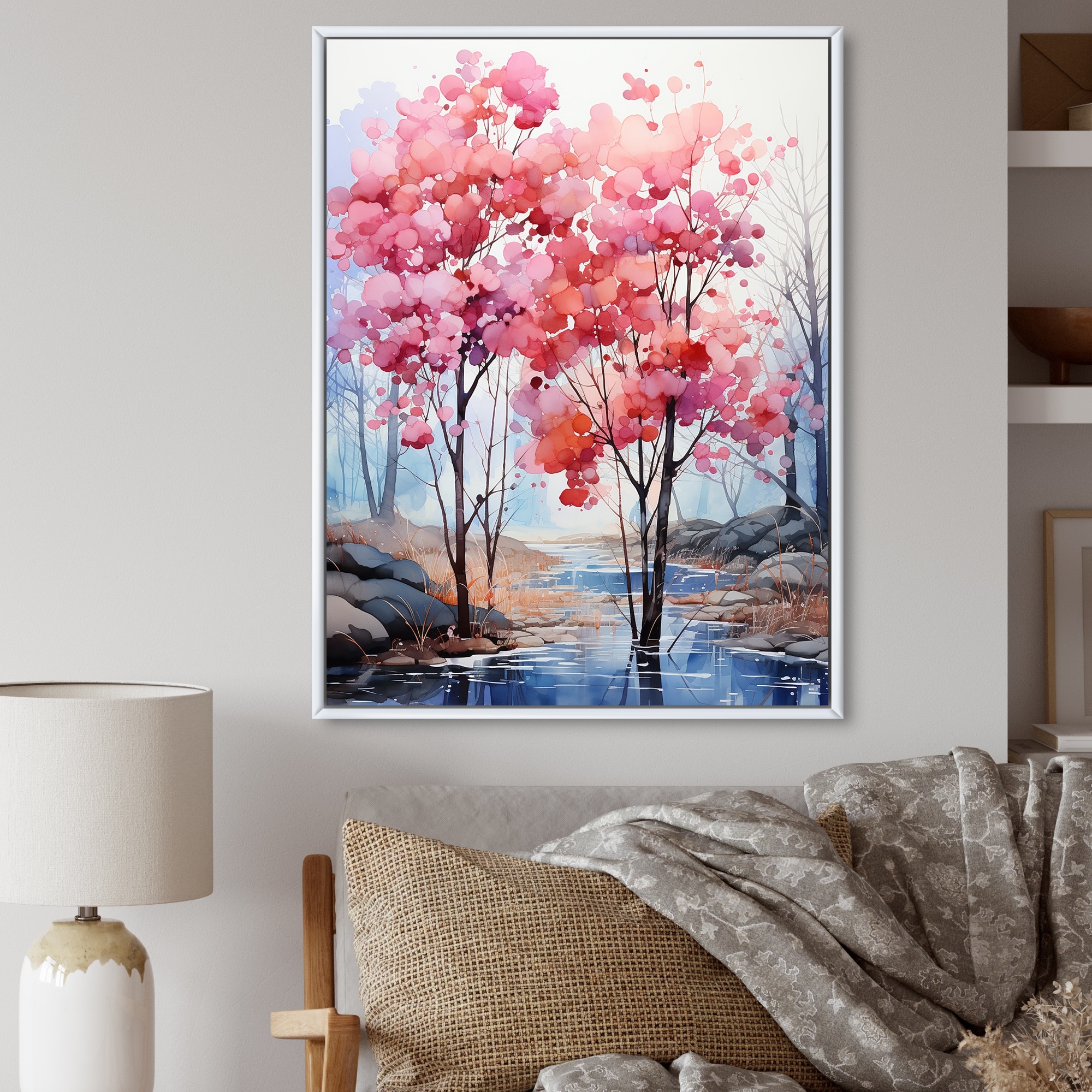 Designart "Pink And Blue Trees Field Pointillism V" Landscape Trees Framed Canvas Wall Art