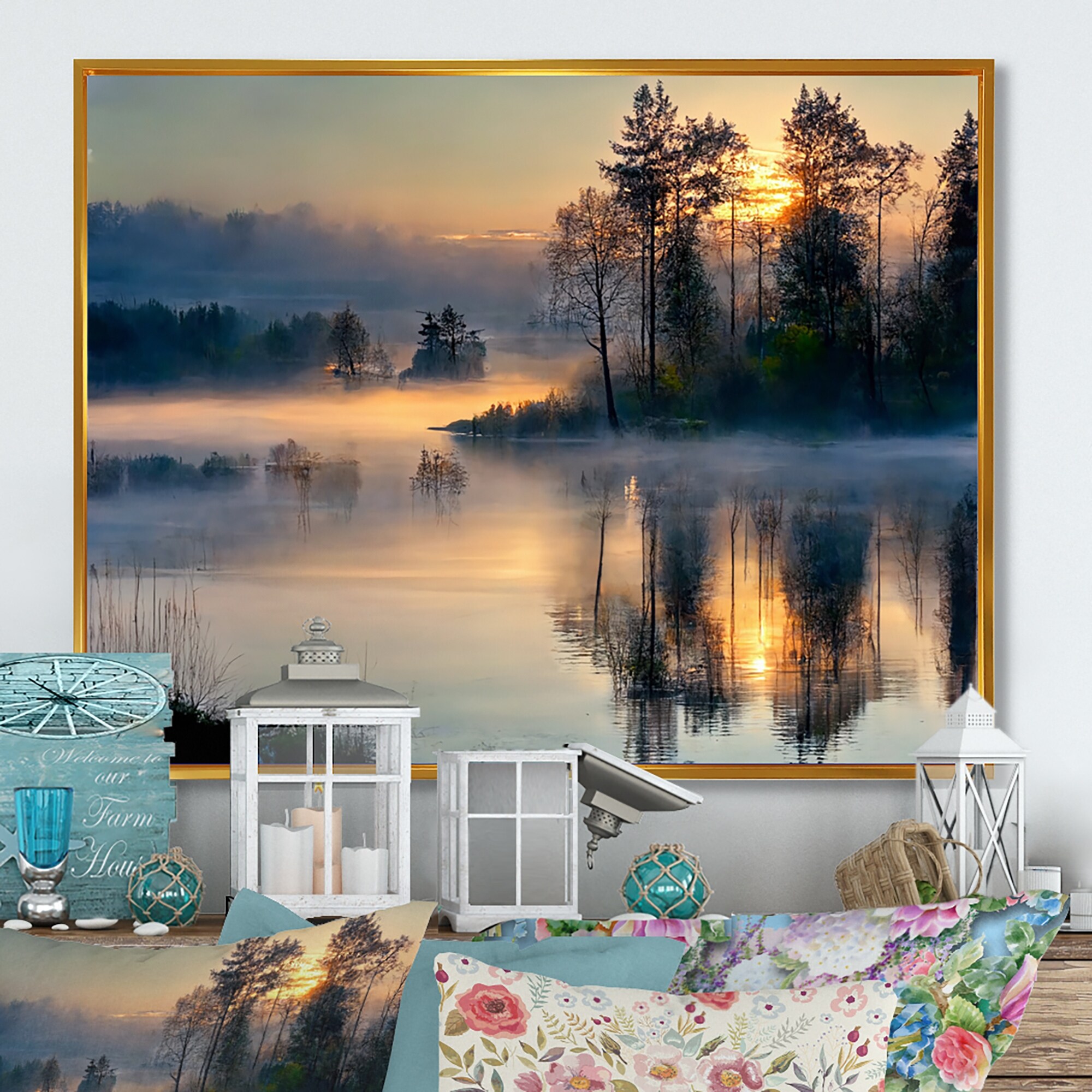 Designart "Morning Fog Over the Lake Sunset II" Landscape Lake Framed Canvas Wall Art Print