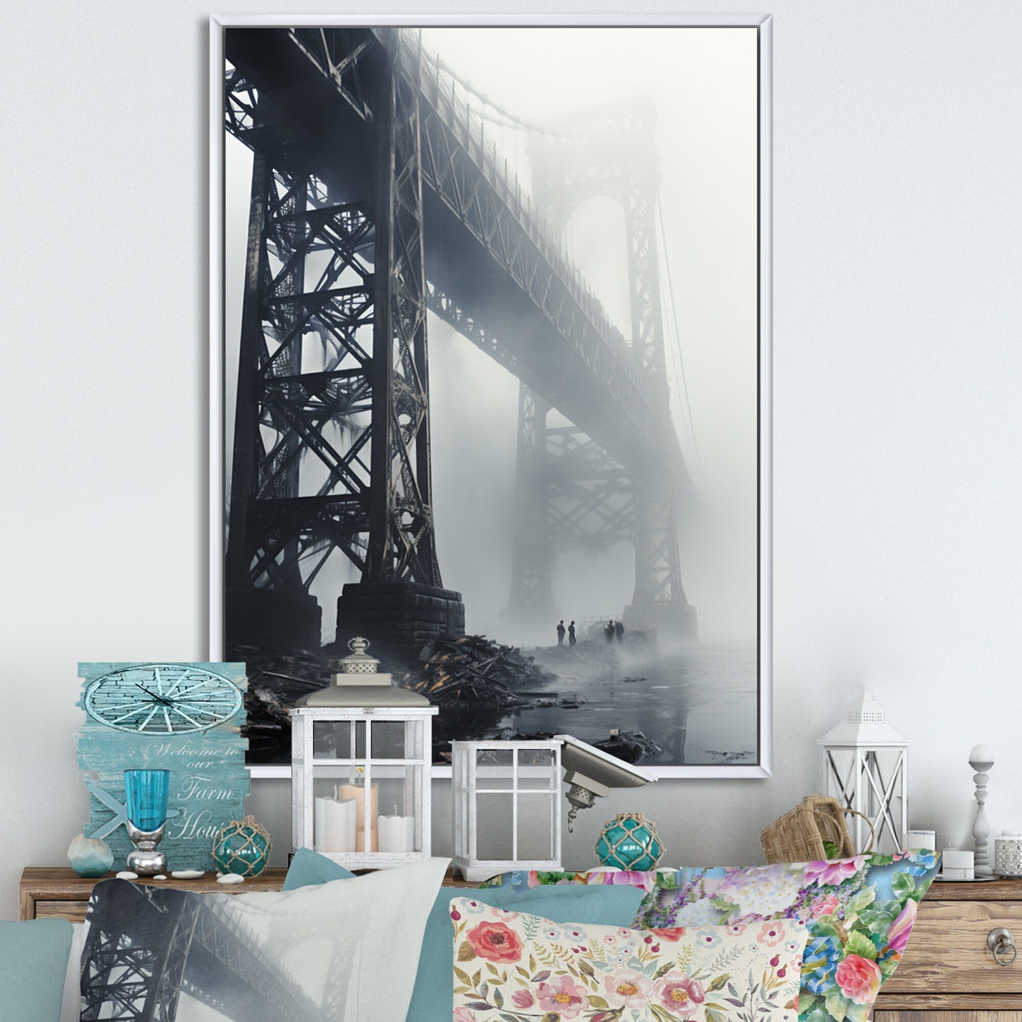 Designart "Grey Bridge in Fog I" Bridges Framed Canvas Art Print