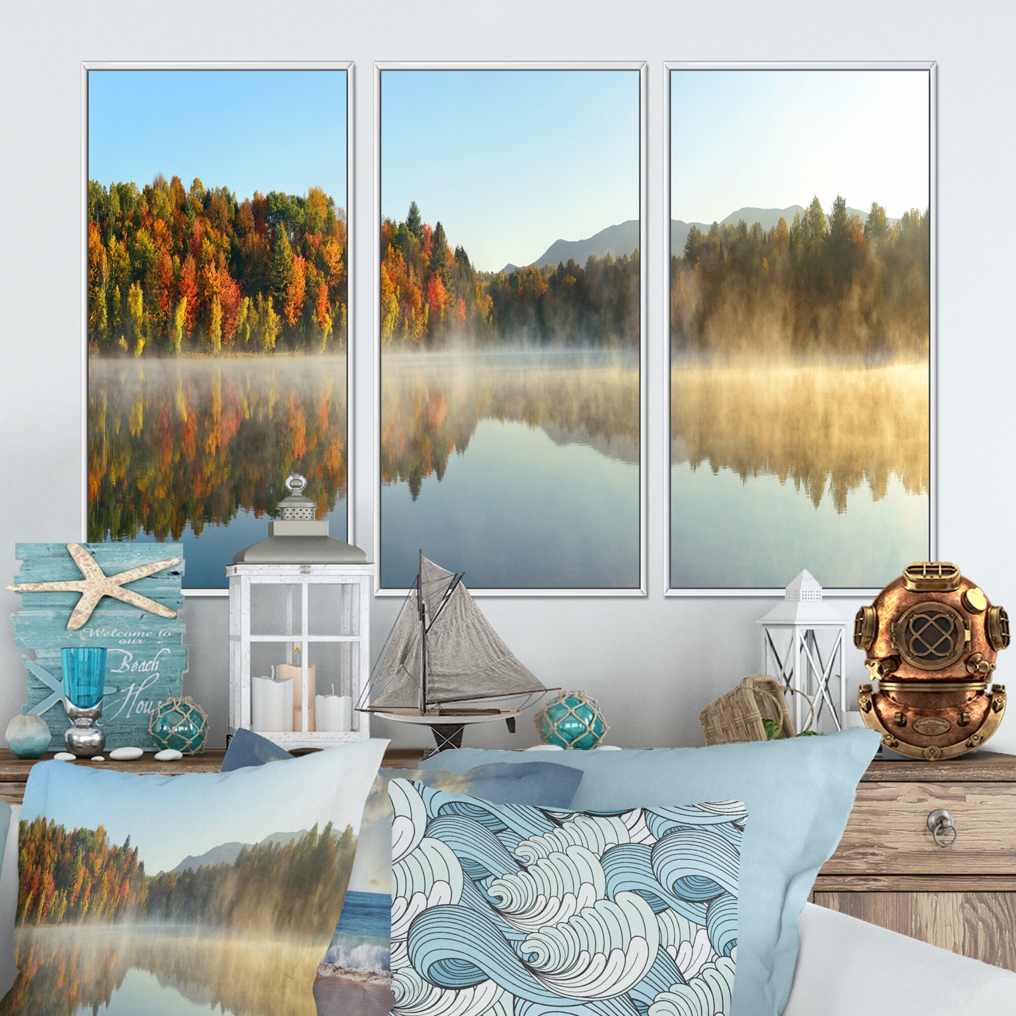 Designart "Lake Autumn Foliage Fog Panorama" Sea & Shore Framed Canvas Wall Art Set of 3 - 4 Colors of Frames