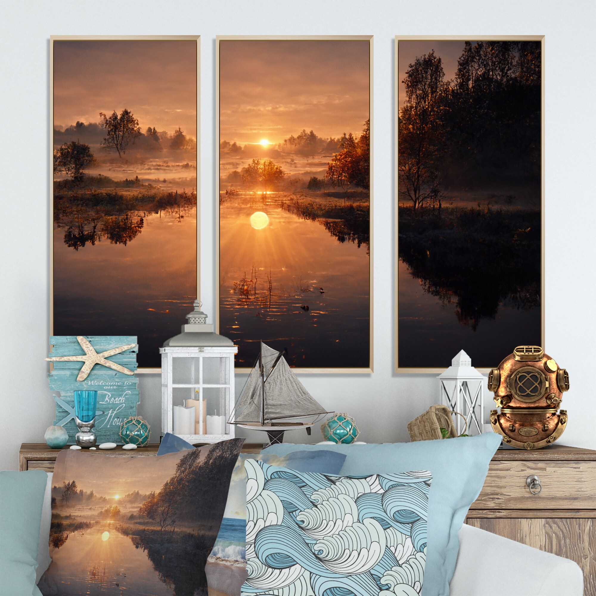 Designart "Morning Fog Over the Lake Sunset V" Landscape Lake Framed Canvas Wall Art Print - 3 Panels