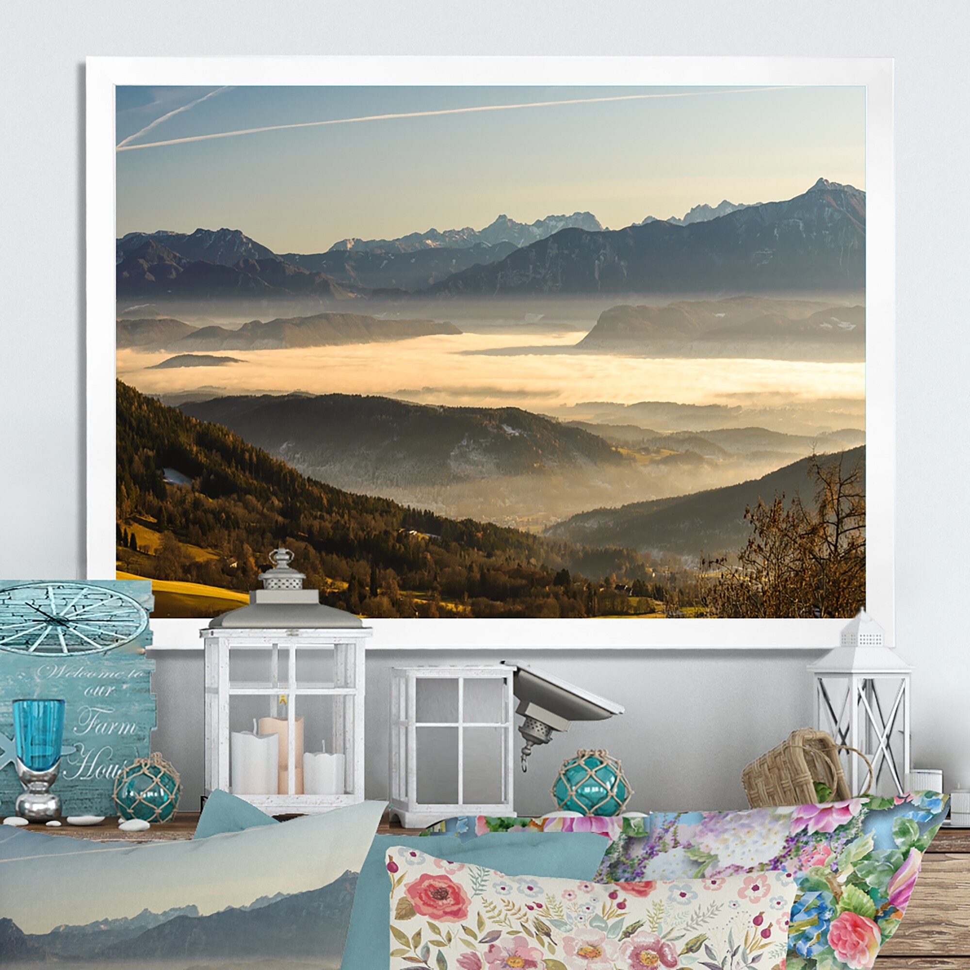 Designart "Mountain Valley in Fog" Traditional Framed artwork