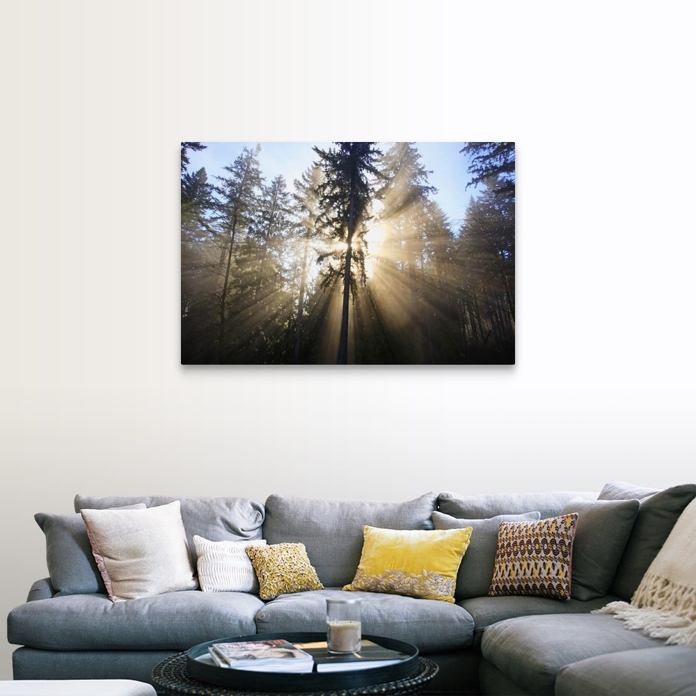 "sun shining through morning fog and trees" Canvas Wall Art