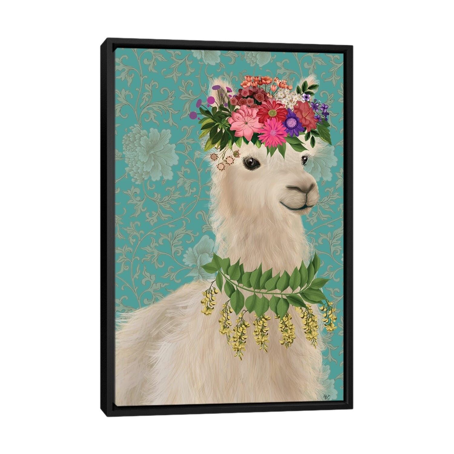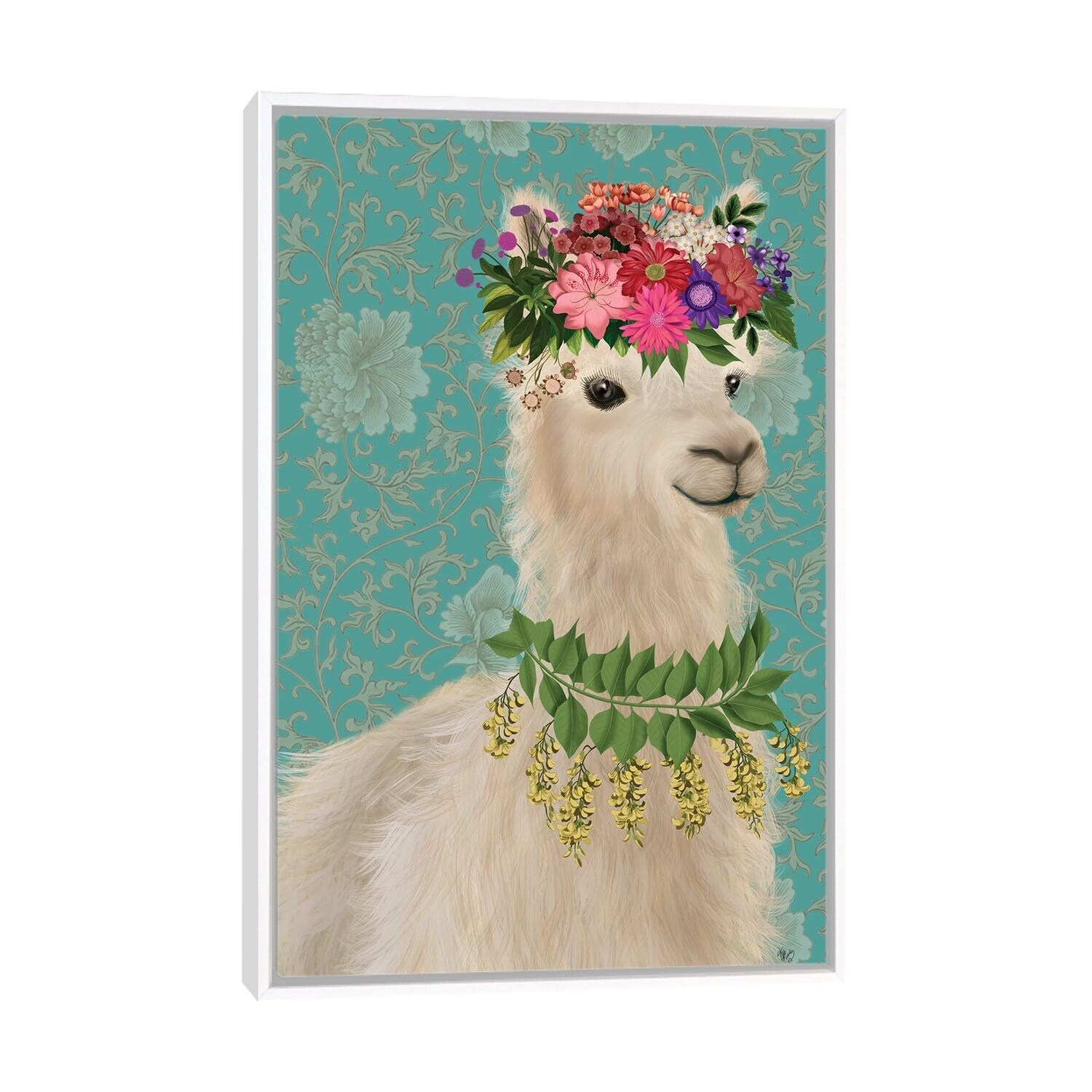 iCanvas "Llama White Flowers" by Fab Funky Framed