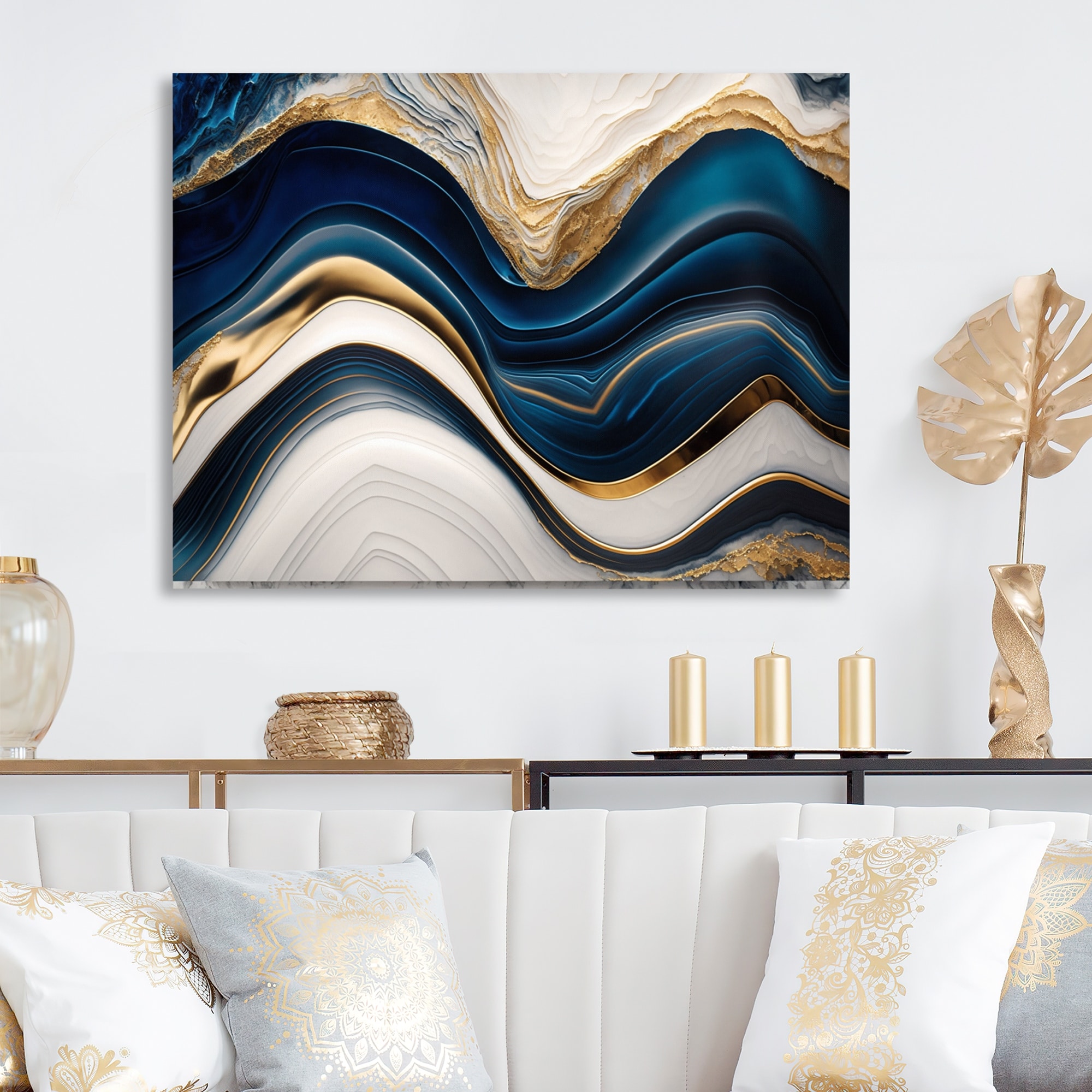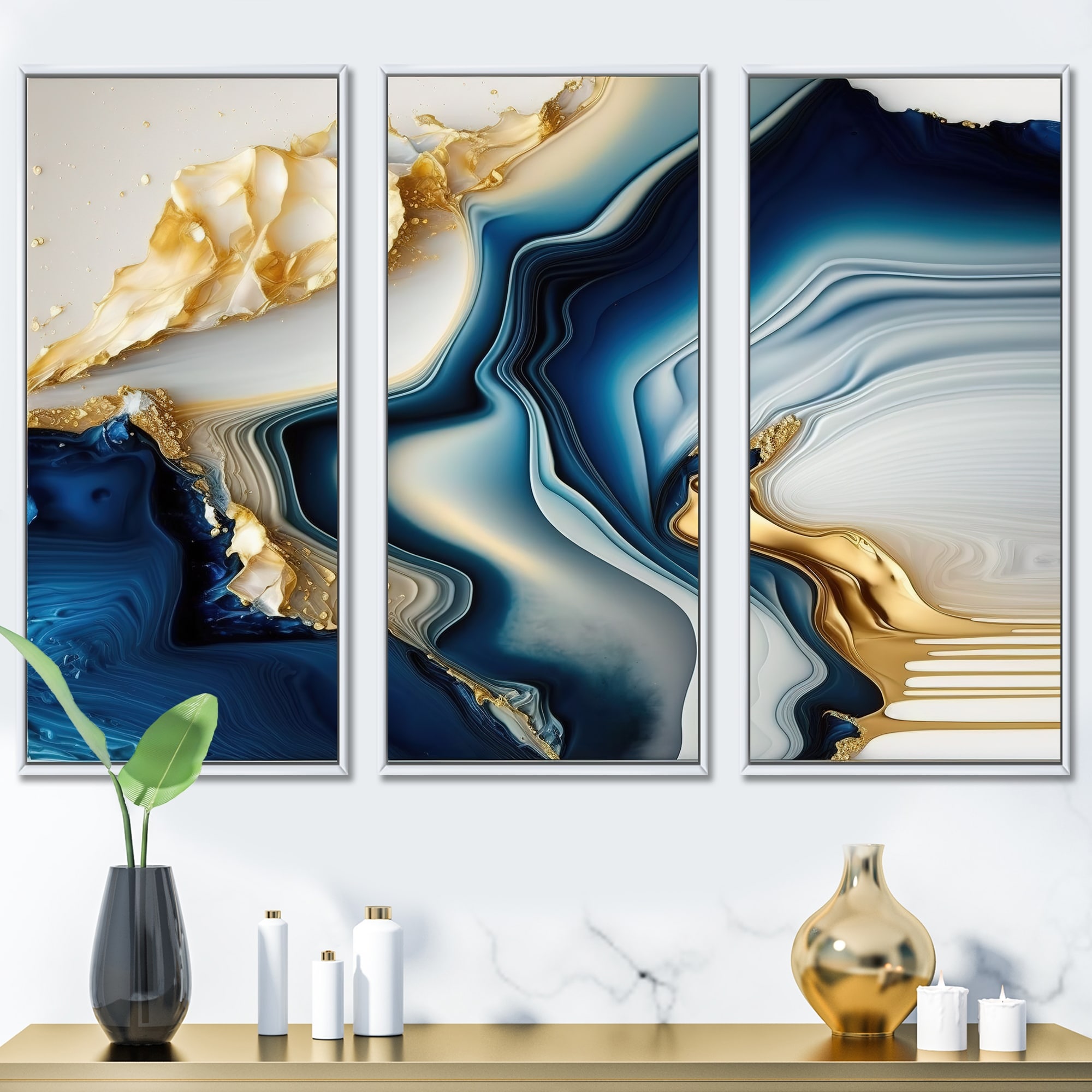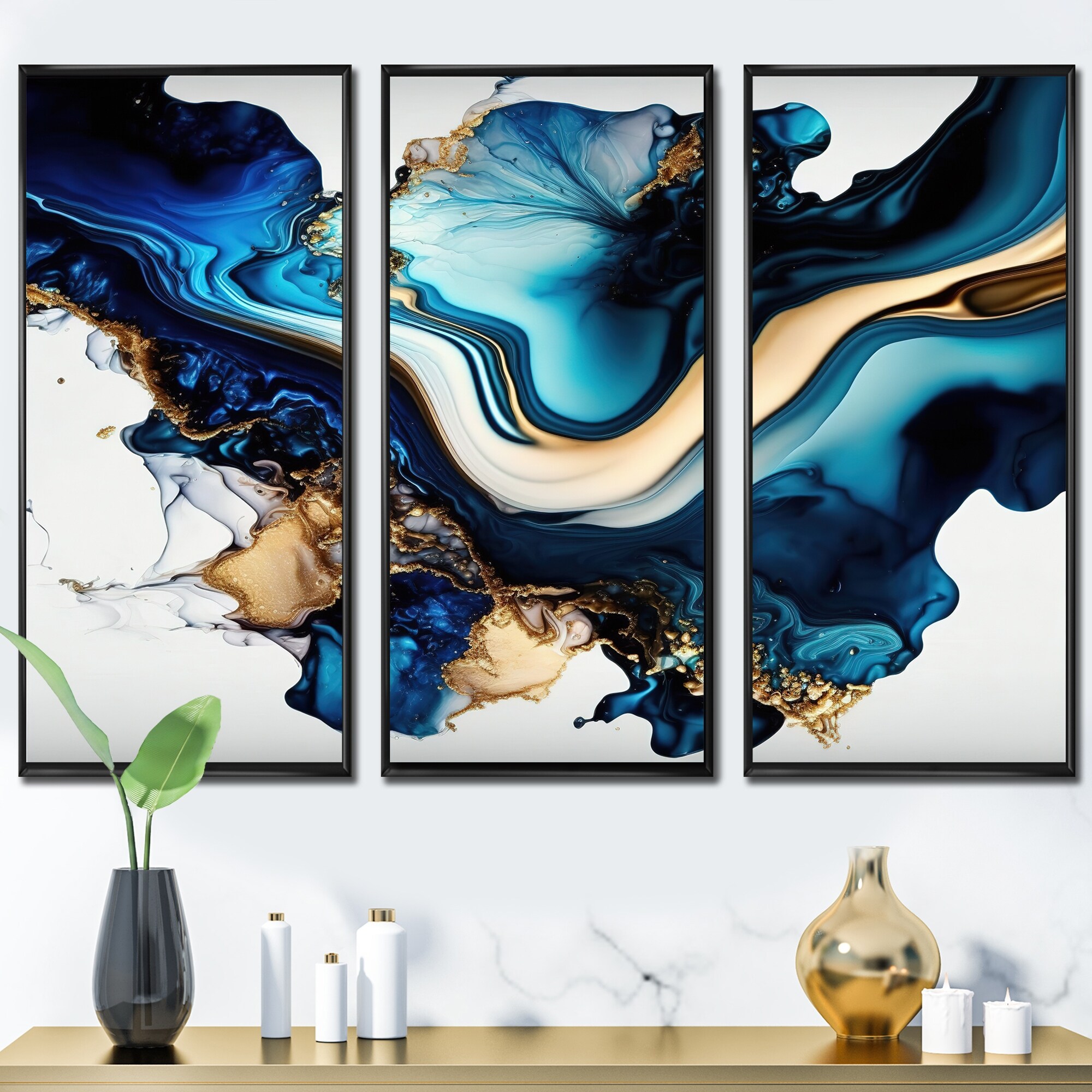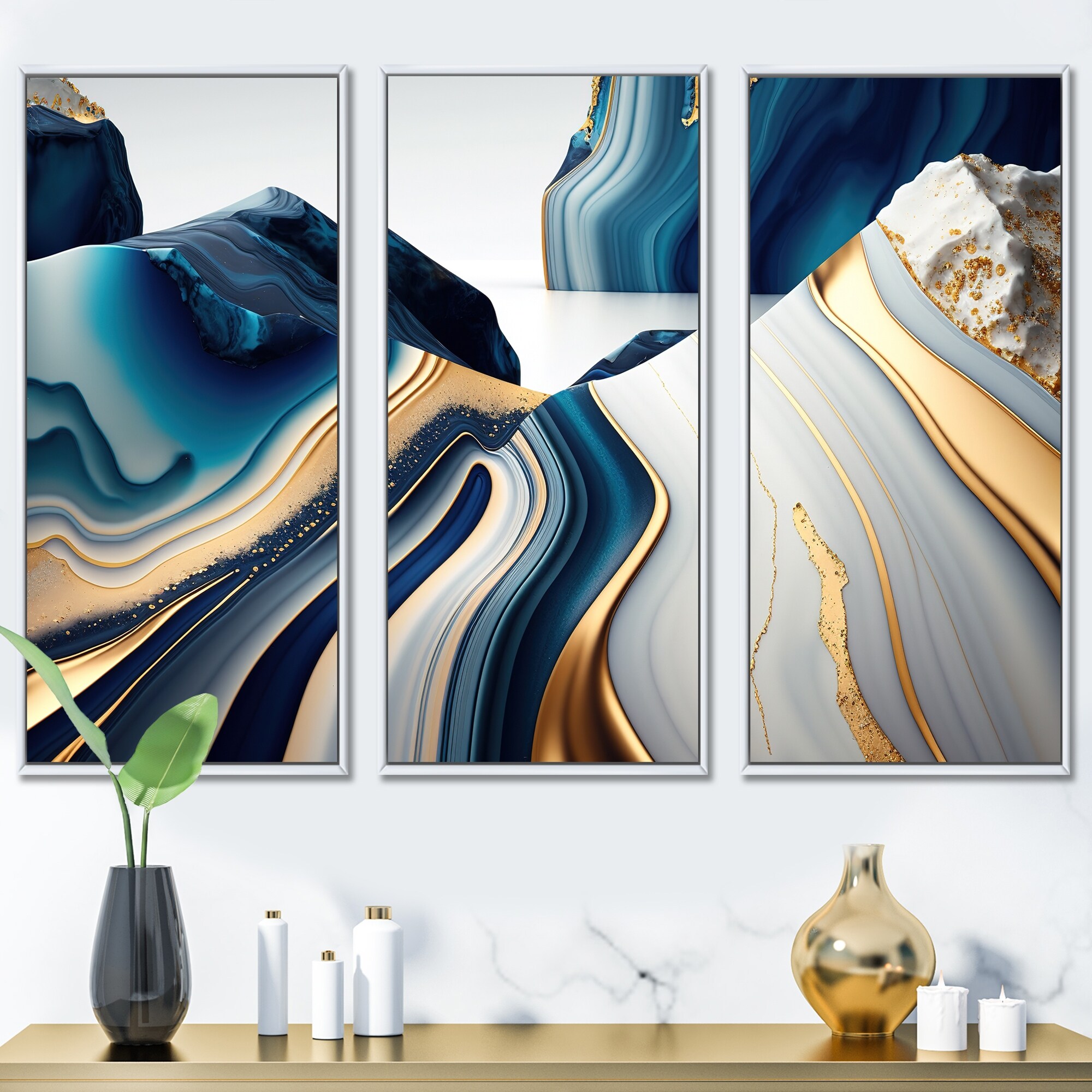 Designart "Abstract Geode Waves Blue And Gold I" Modern Waves Framed Canvas Art Print - 3 Panels