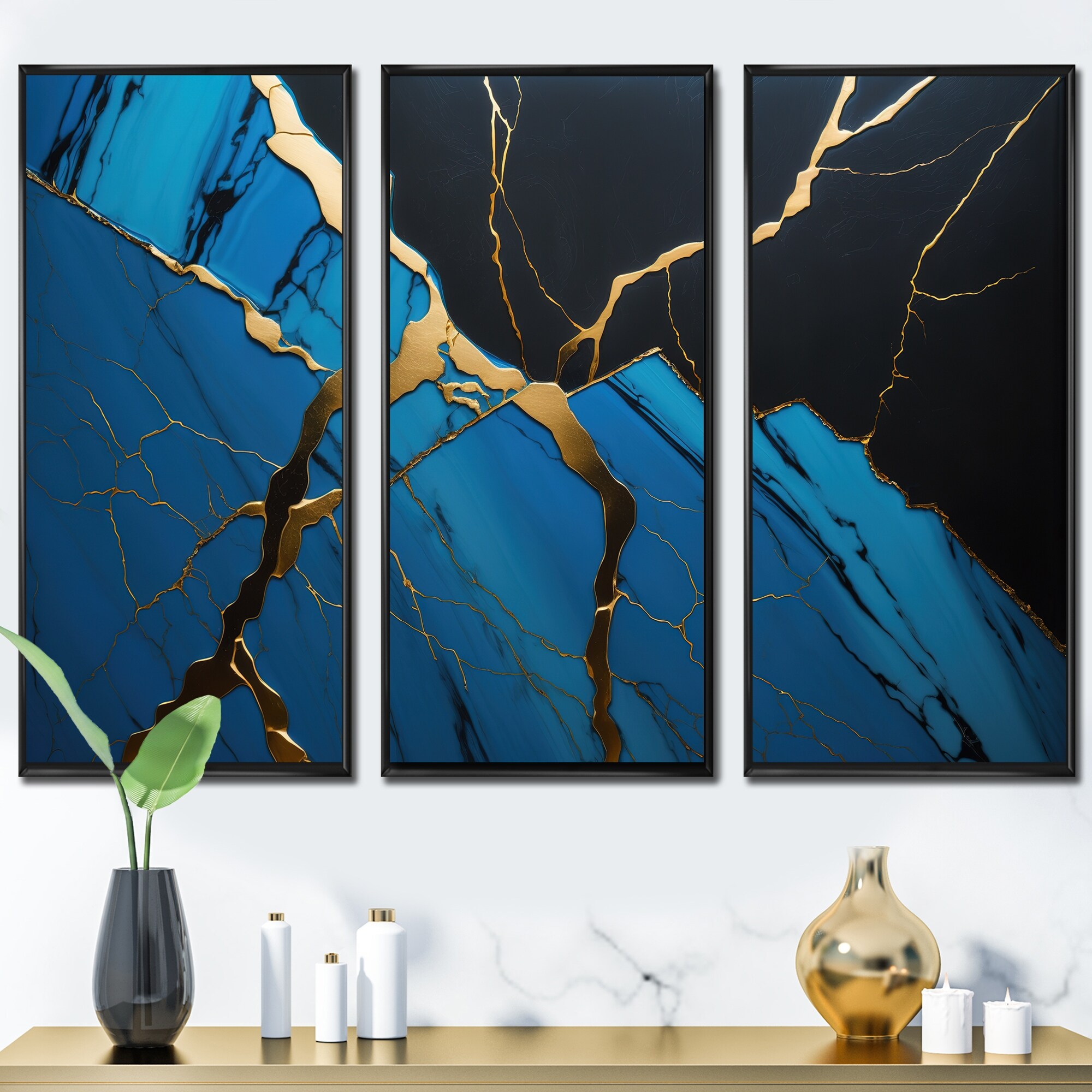 Designart "Abstract Geode Gold And Blue Marble II" Abstract Marble Framed Canvas Art Print - 3 Panels