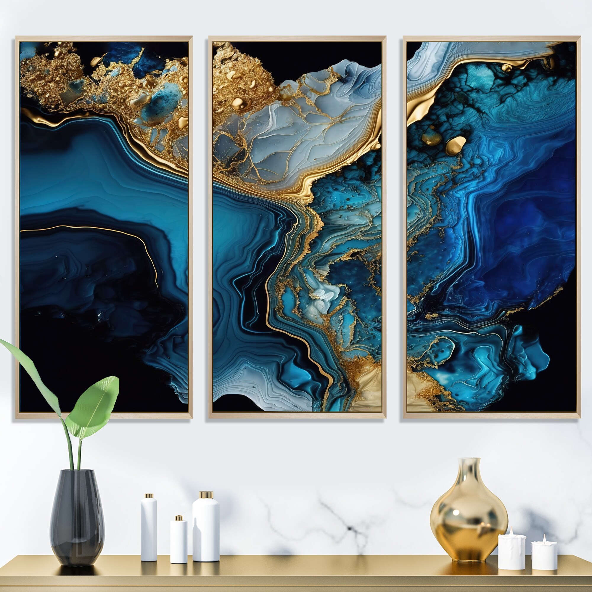 Designart "Abstract Geode Gold And Blue Marble I" Abstract Marble Framed Canvas Art Print - 3 Panels