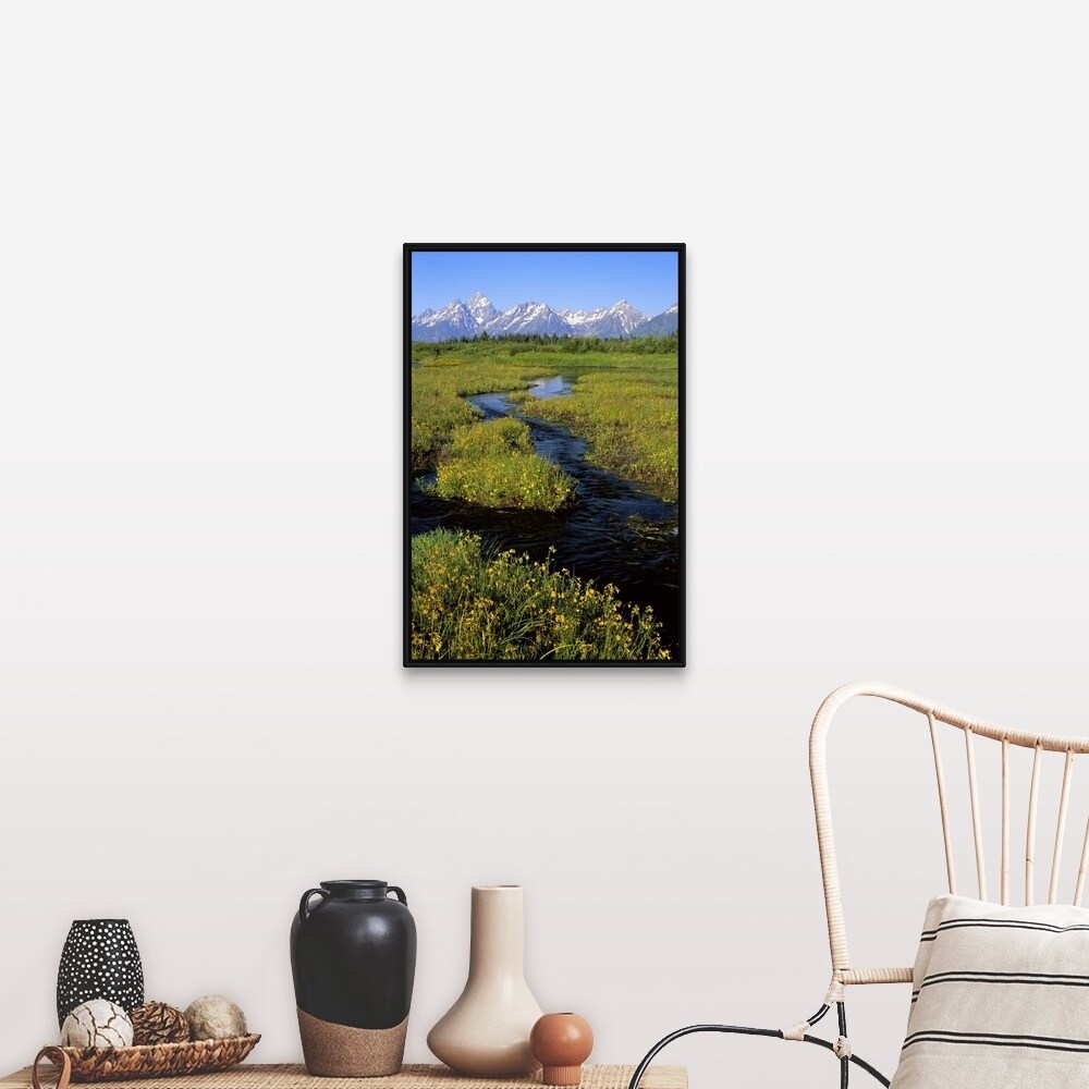"Wyoming, Grand Teton National Park, Water flowing through the landscape" Black Float Frame Canvas Art