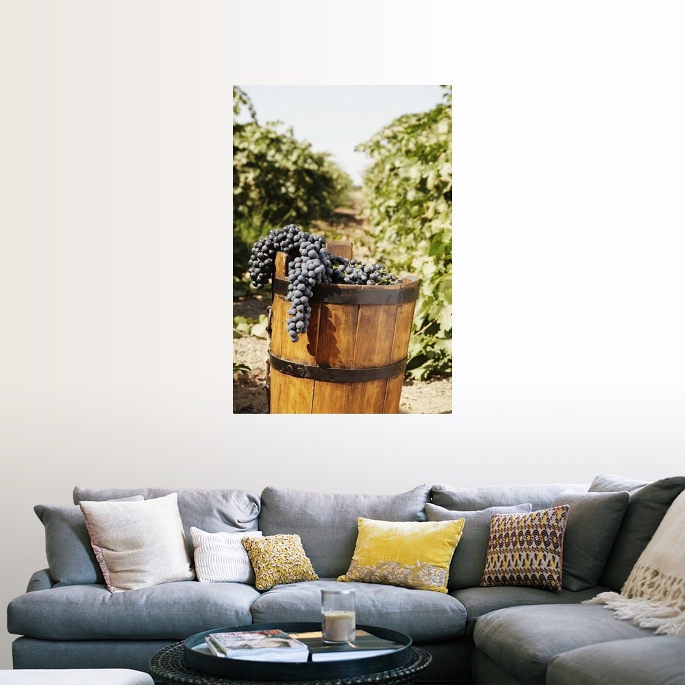 "Red grapes in antique basket in vineyard" Poster Print - Multi
