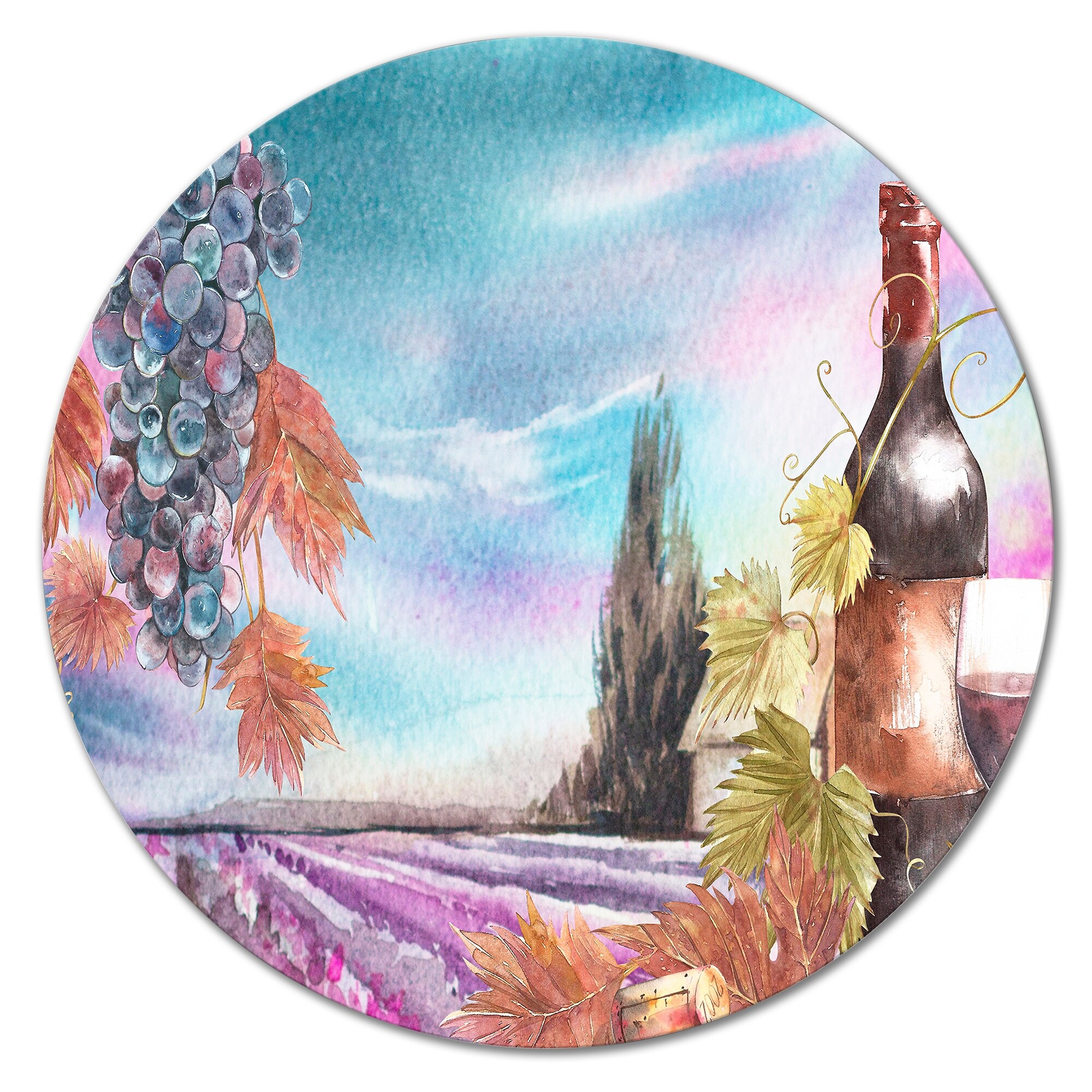 Designart 'Bottles And Leaves of Grapes, A Lavender Field I' Country Metal Circle Wall Art