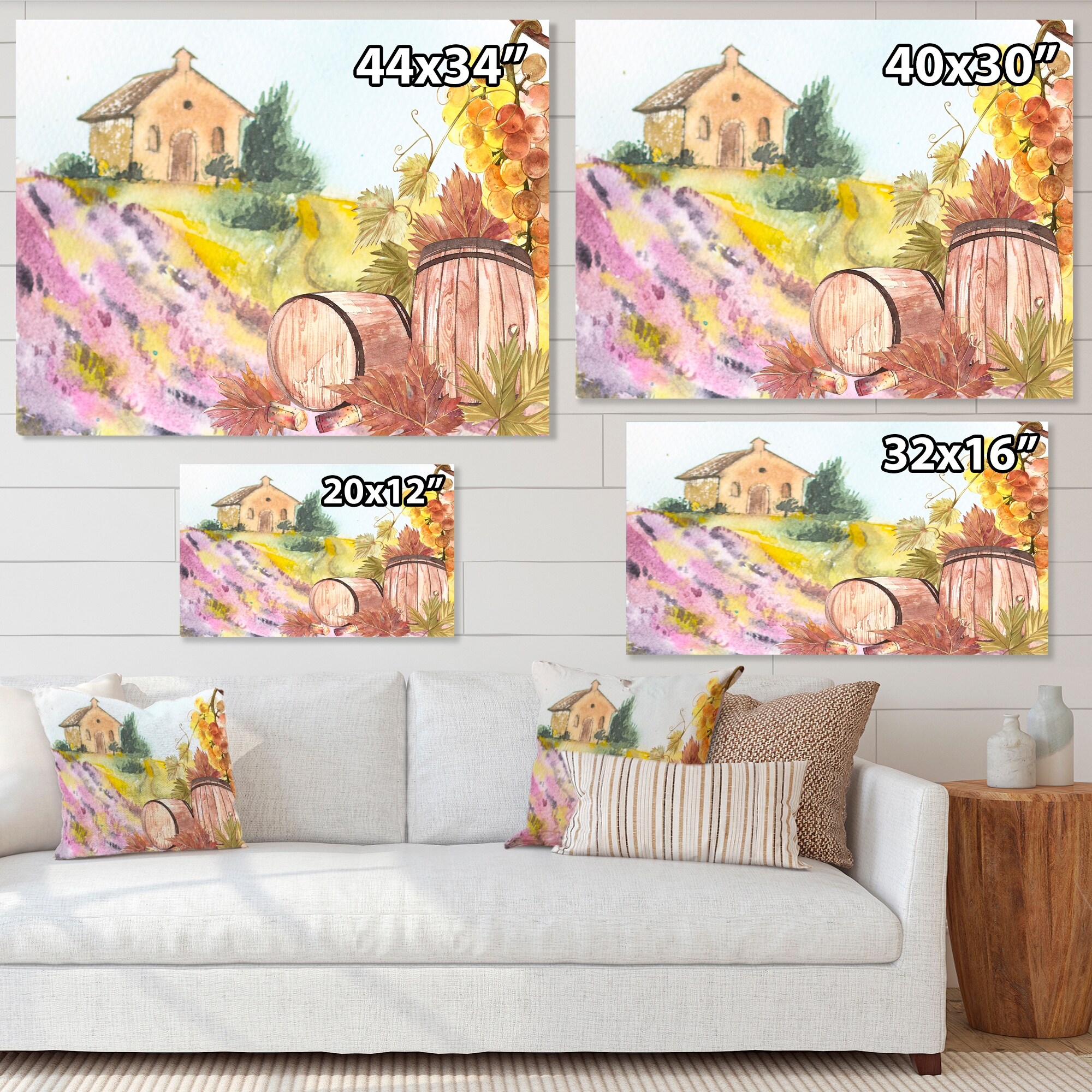 Designart "Bottles And Leaves of Grapes, A Lavender Field II" Country Framed Canvas Wall Art Print