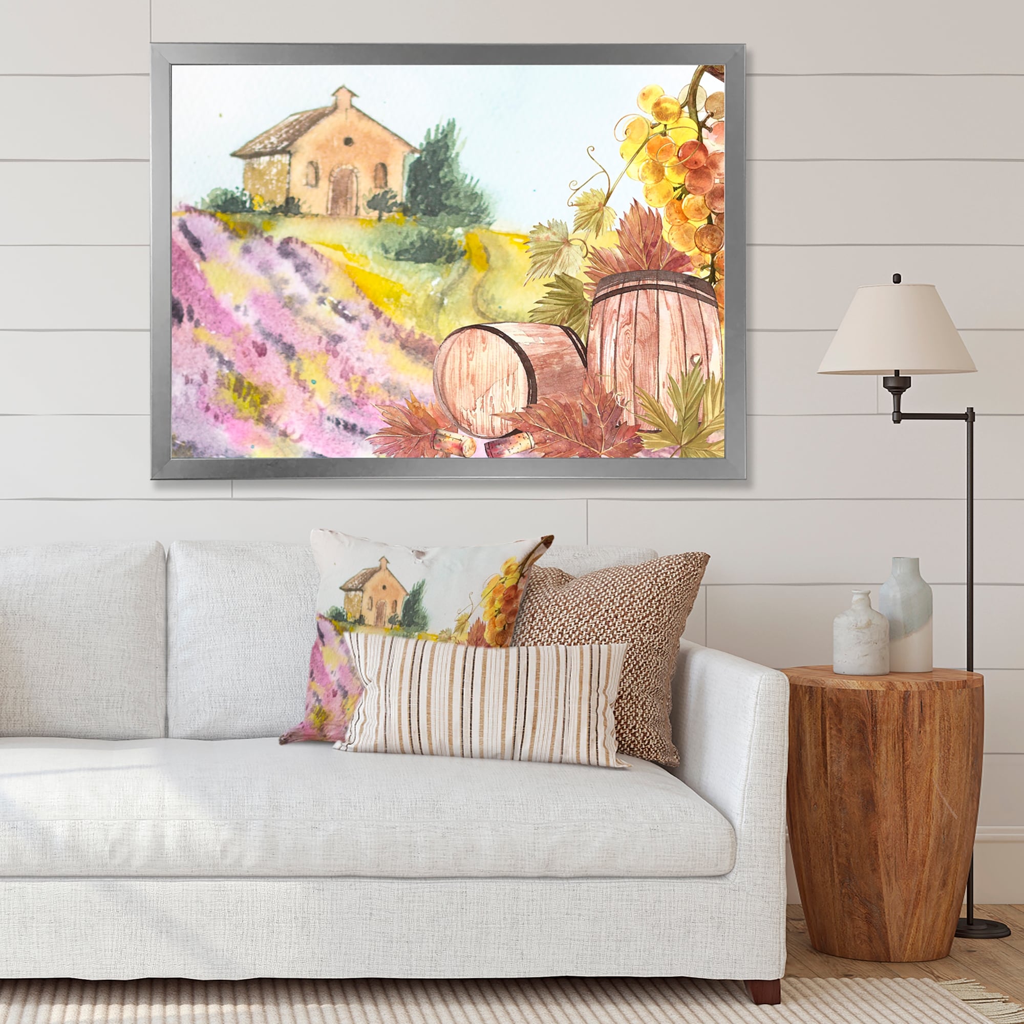 Designart "Bottles And Leaves of Grapes, A Lavender Field I" Country Framed Art Print