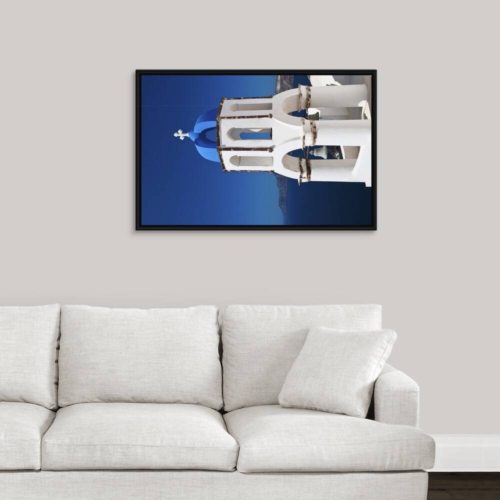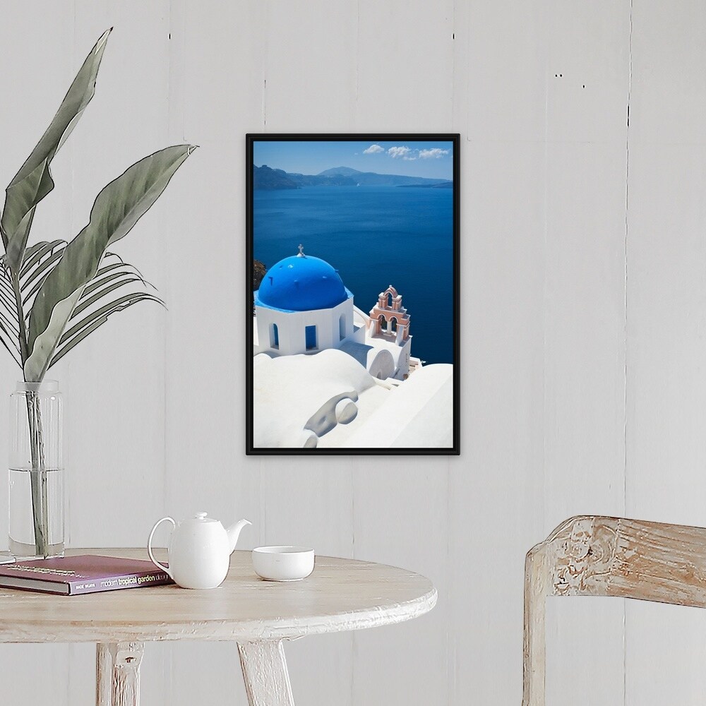 "Greece, Cyclades Islands, Santorini, Oia, Church bell tower at coast" Black Float Frame Canvas Art