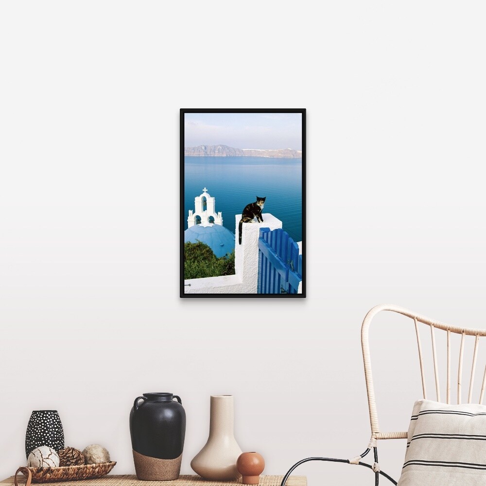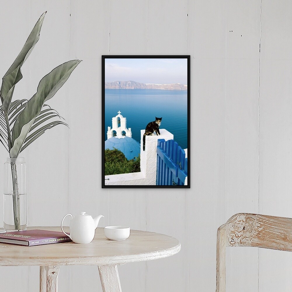 "A cat resting on a gate in Santorini, Greece" Black Float Frame Canvas Art
