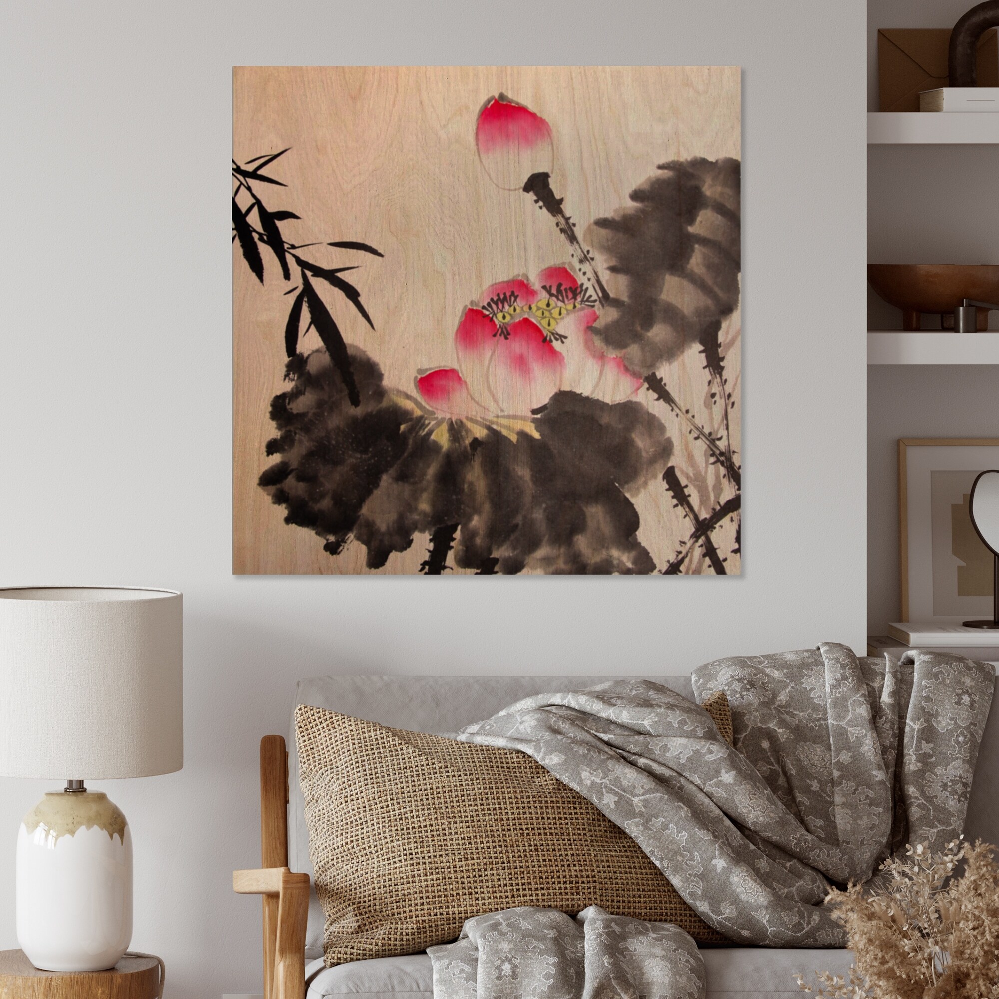 Designart 'Ink Lotus Painting Hand Drawn' Traditional Wood Wall Art Décor - Natural Pine Wood