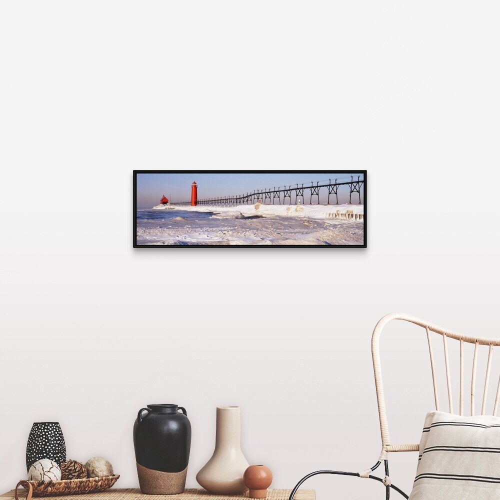 "Lighthouse near a pier, Grand Haven, Michigan" Black Float Frame Canvas Art