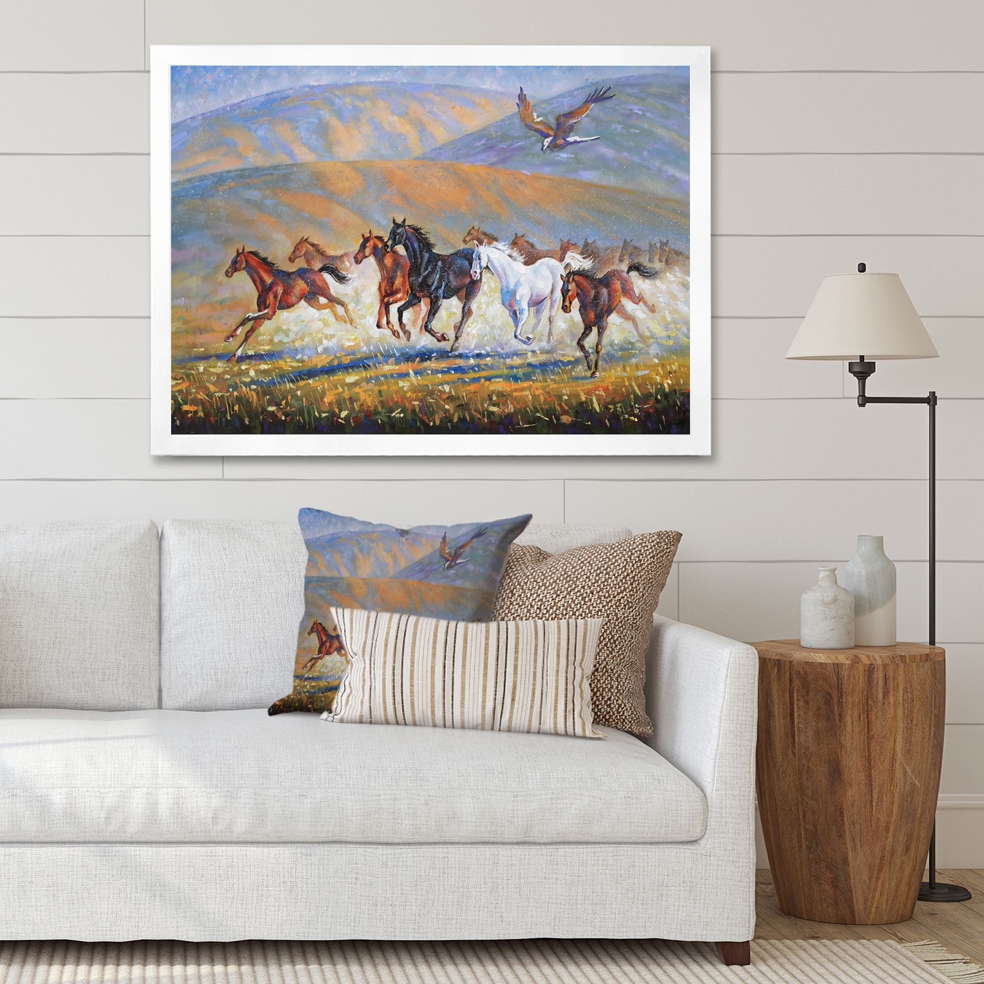 Designart "A Large Eagle Over the Running Herd of Horses" Traditional Framed Art Print