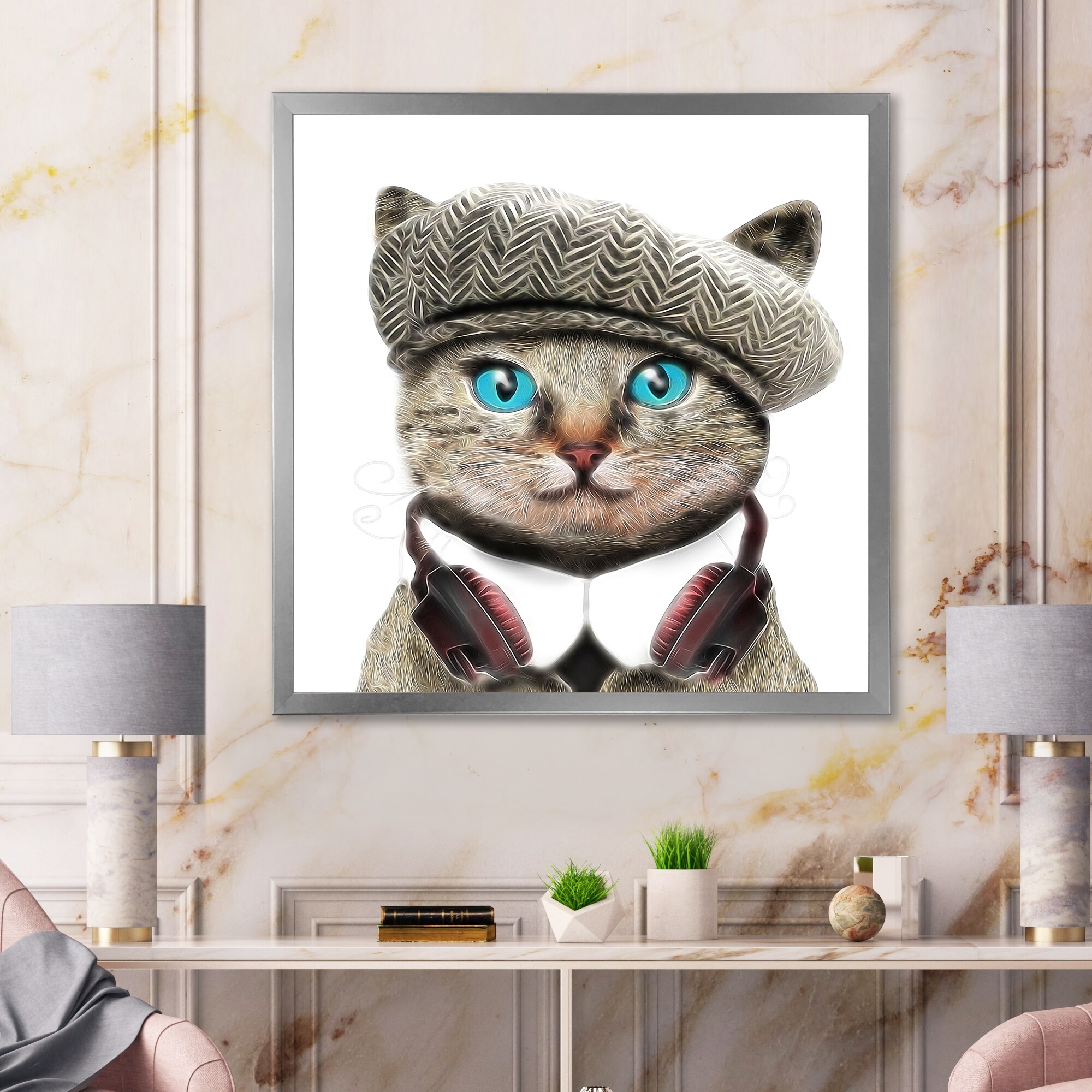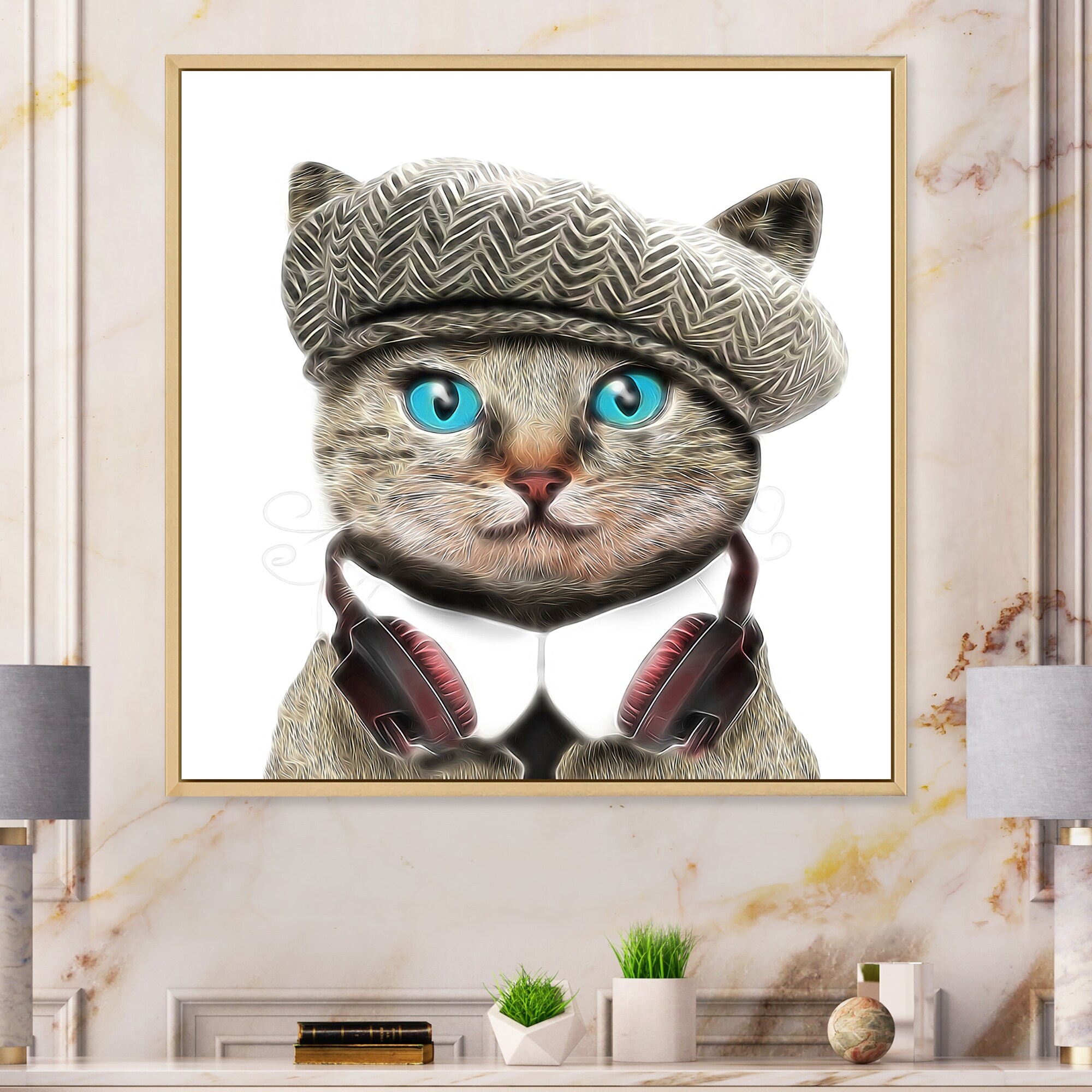 Designart "Hipster Funny Cat in Hat" Children's Art Framed Canvas Wall Decor