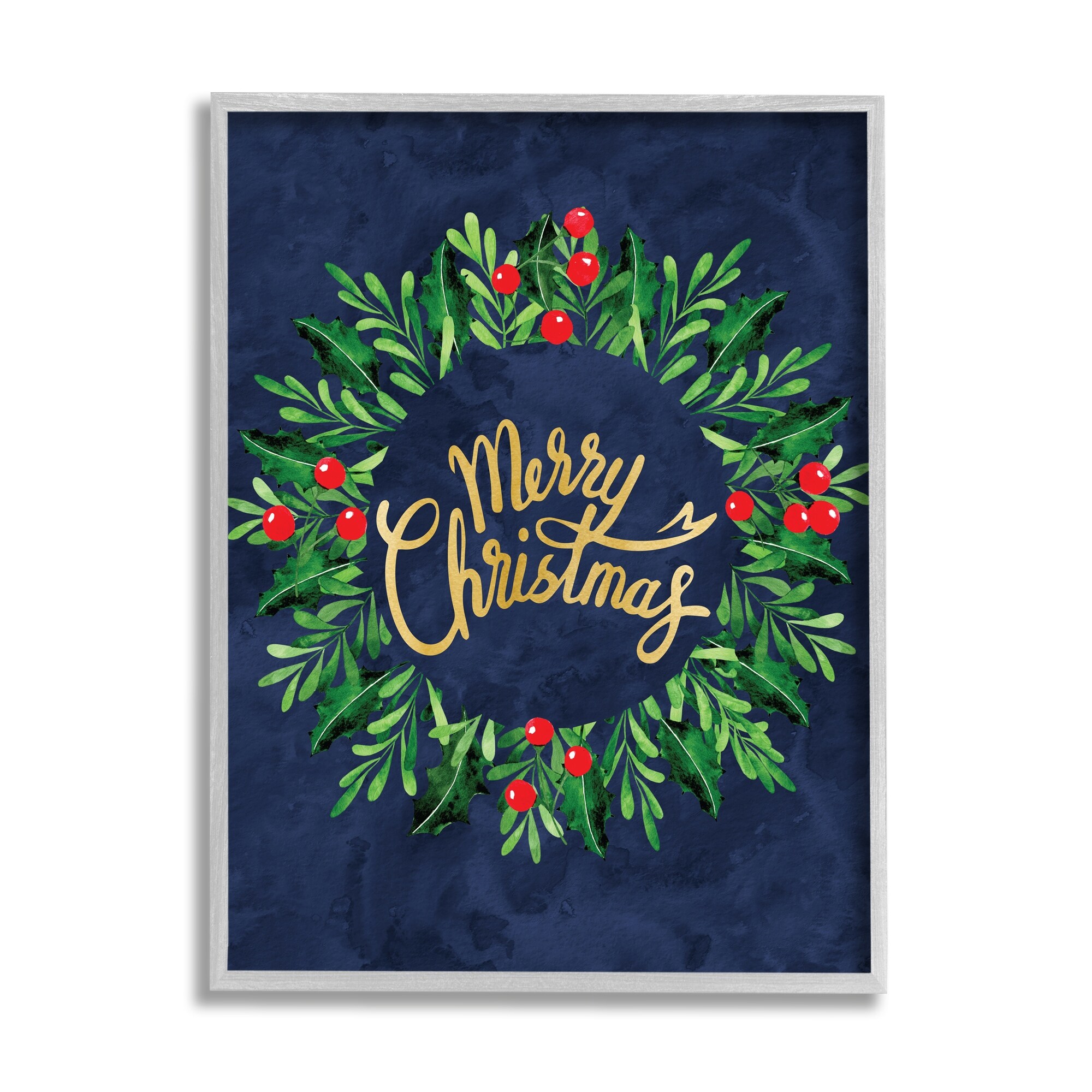 Stupell Playful Red Holly Holiday Wreath Festive Merry Christmas Framed Wall Art - Blue