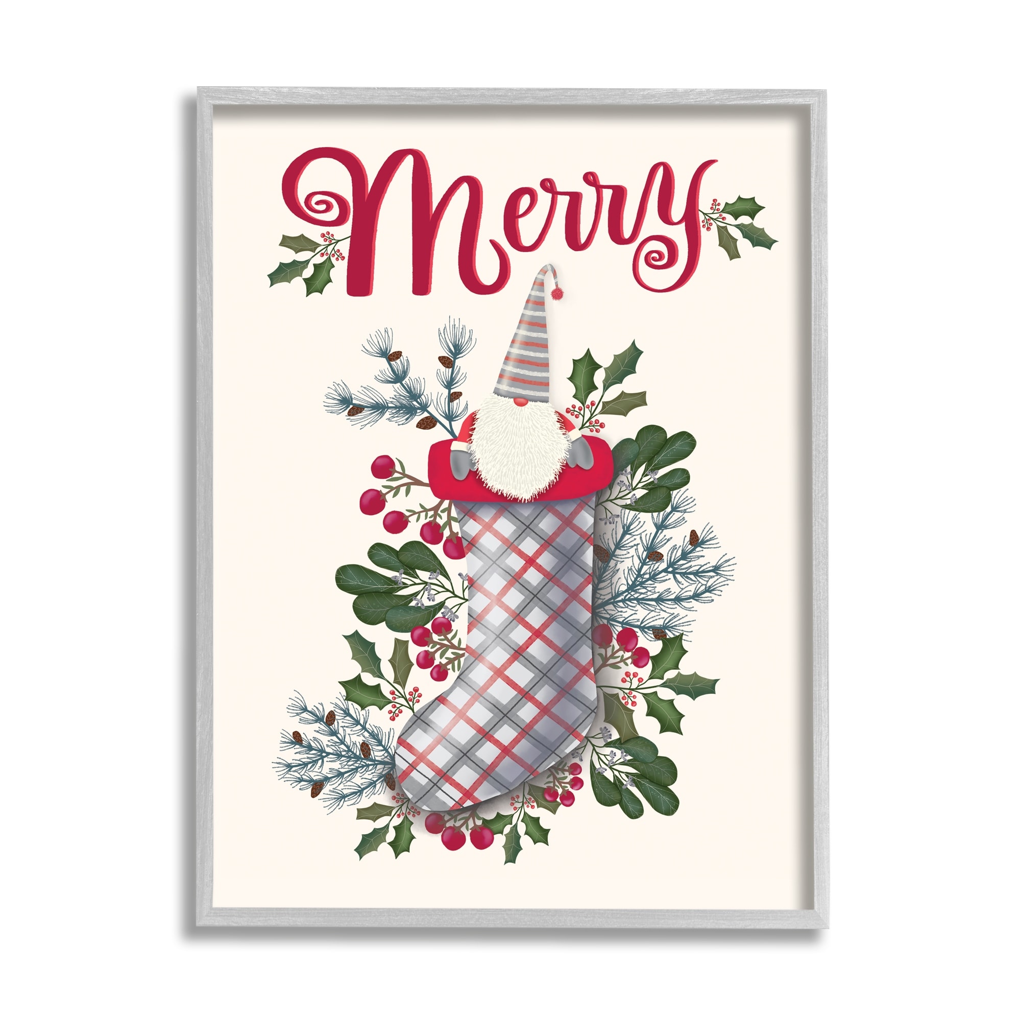 Stupell Industries Merry Sentiment Christmas Gnome in Plaid Holly Stocking Framed Wall Art