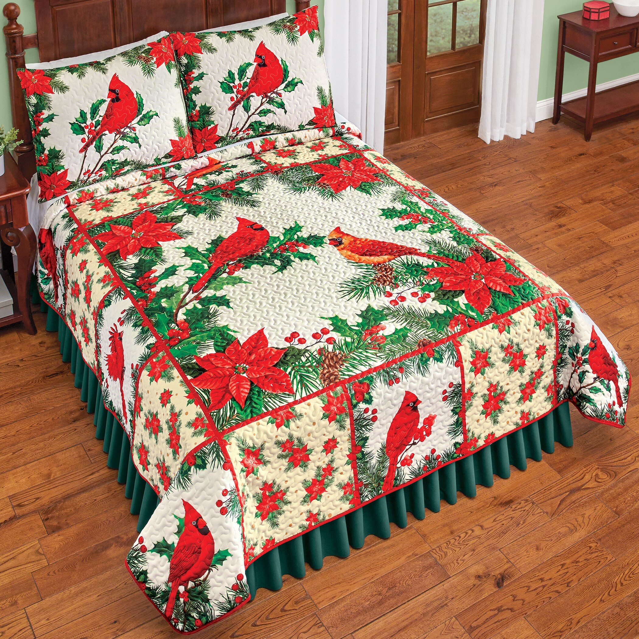 Cardinals And Holly Poinsettia All-Over Texture Quilt