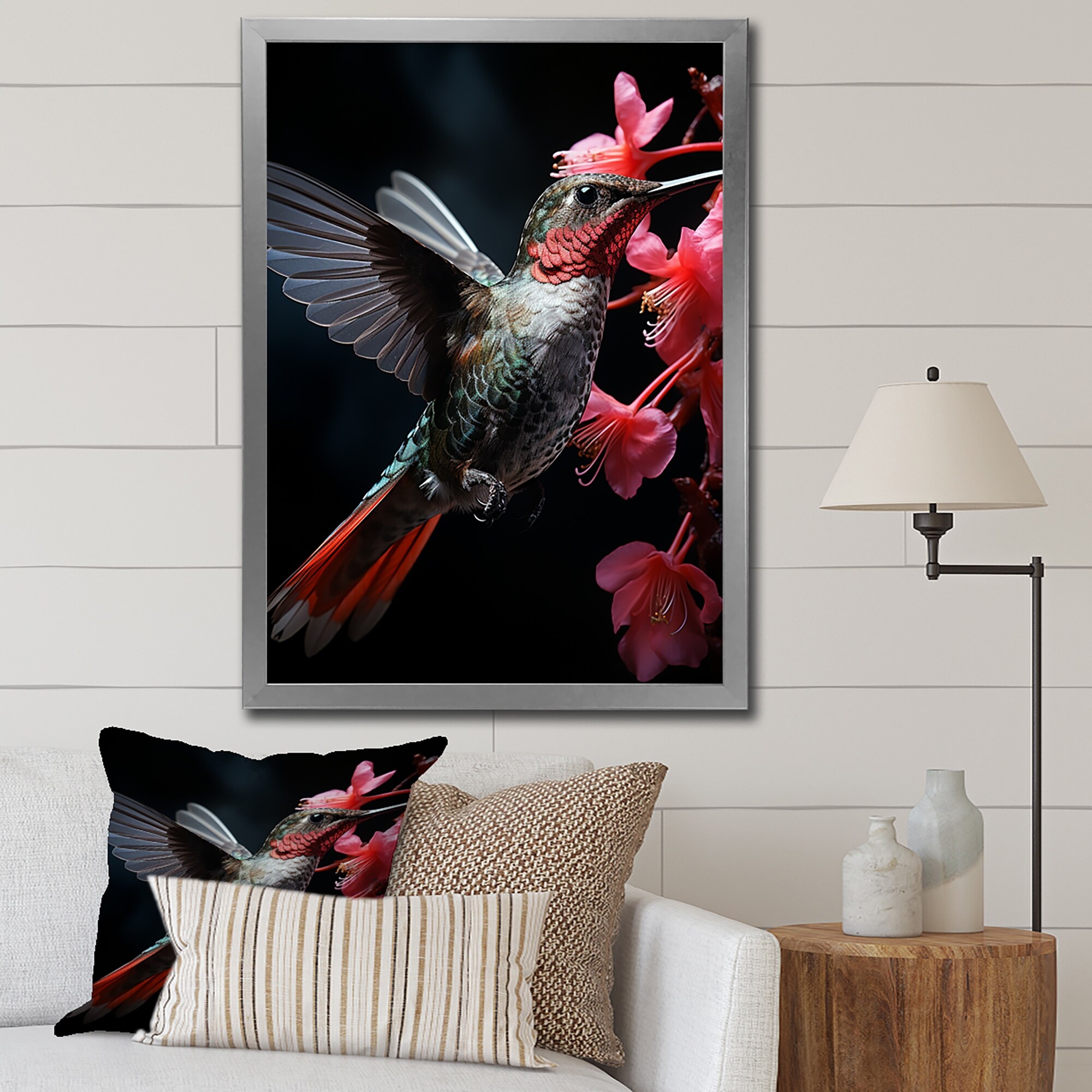 Designart "Grey Coral Hummingbird Portrait Vibrant I" Animals Hummingbird Framed Wall Decor