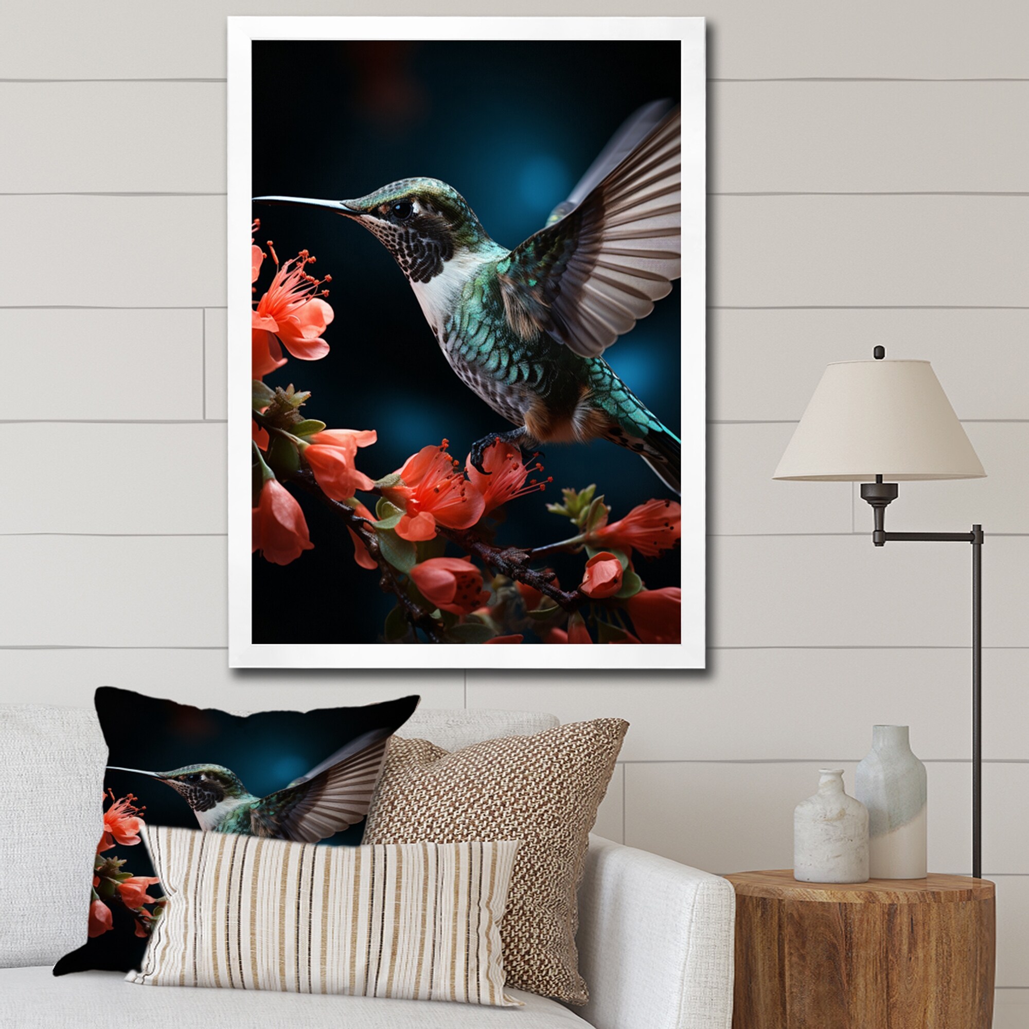 Designart "Teal Coral Hummingbird Portrait Vibrant" Animals Hummingbird Framed Canvas Wall Art