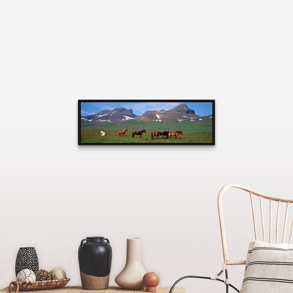 "Iceland, Borgarfjordur, Horses standing and grazing in a meadow" Black Float Frame Canvas Art