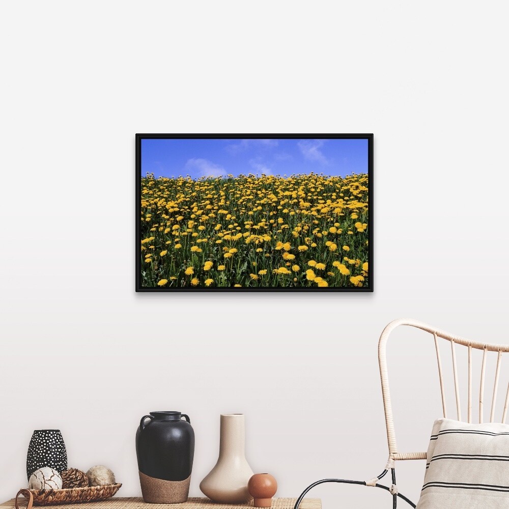 "Close-up of dandelion flowers in a field, Iceland" Black Float Frame Canvas Art
