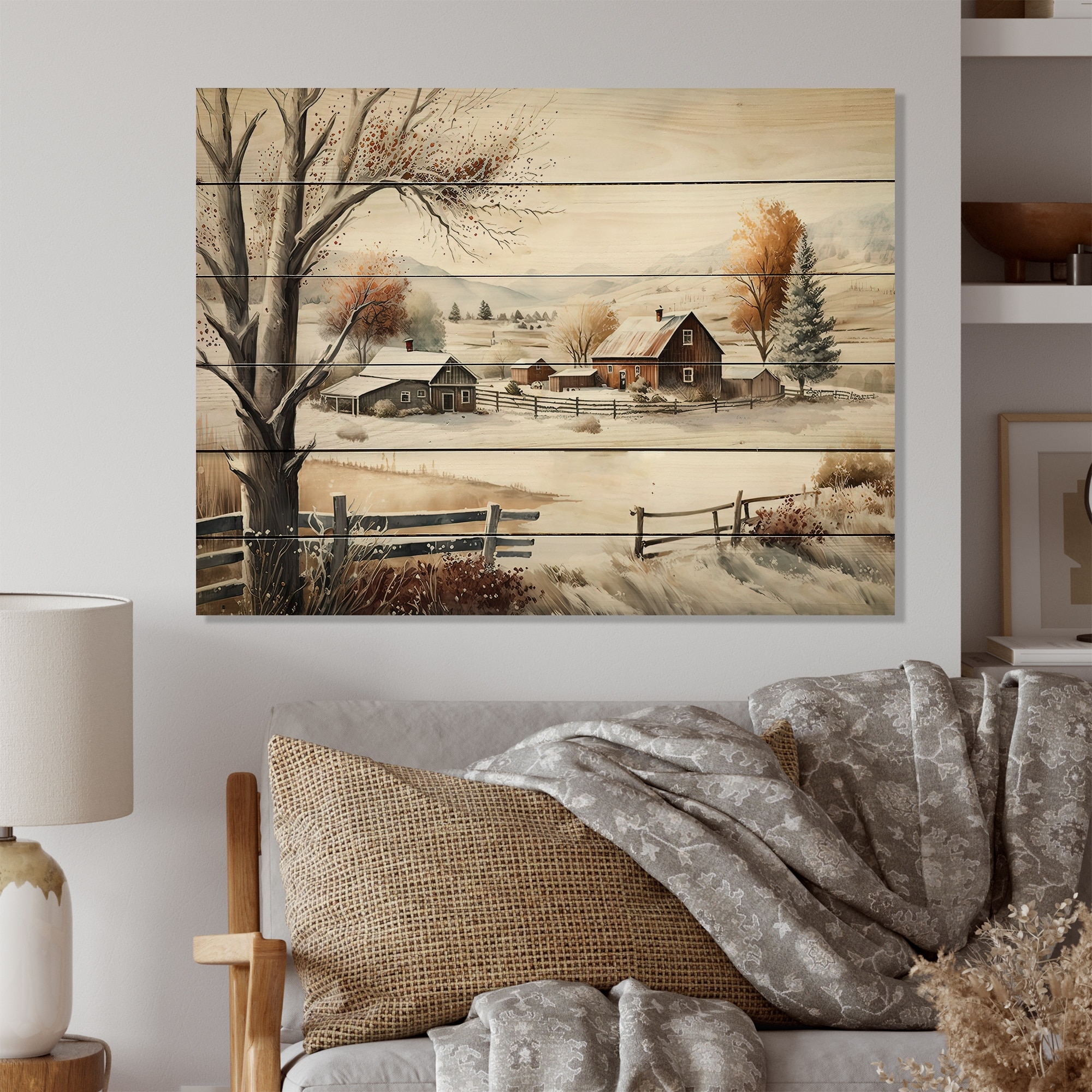 Designart 'Kansas Farm in Winter'Farm Landscape Wood Wall Art - Natural Pine Wood