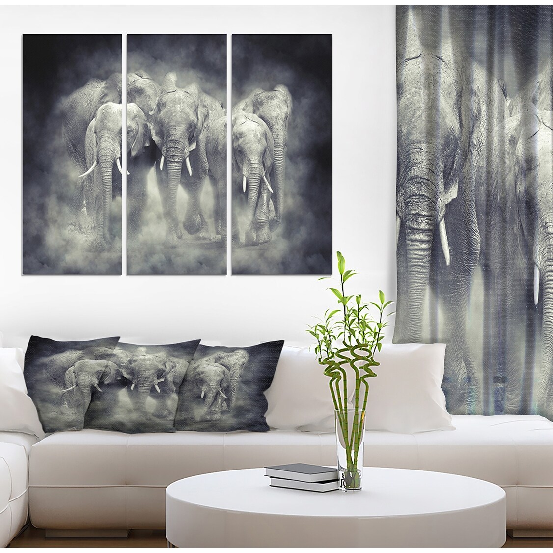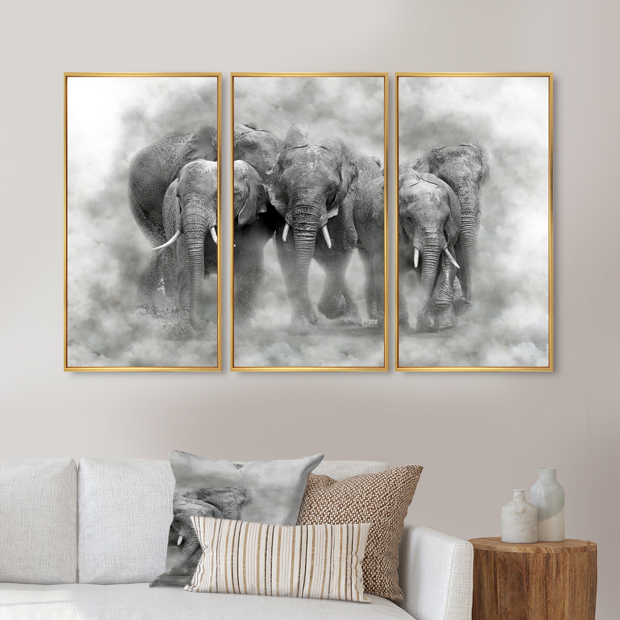 Designart "Kenya National Park Elephant in smoke" Animal Framed Wall Decor Set of 3 - 4 Colors of Frames