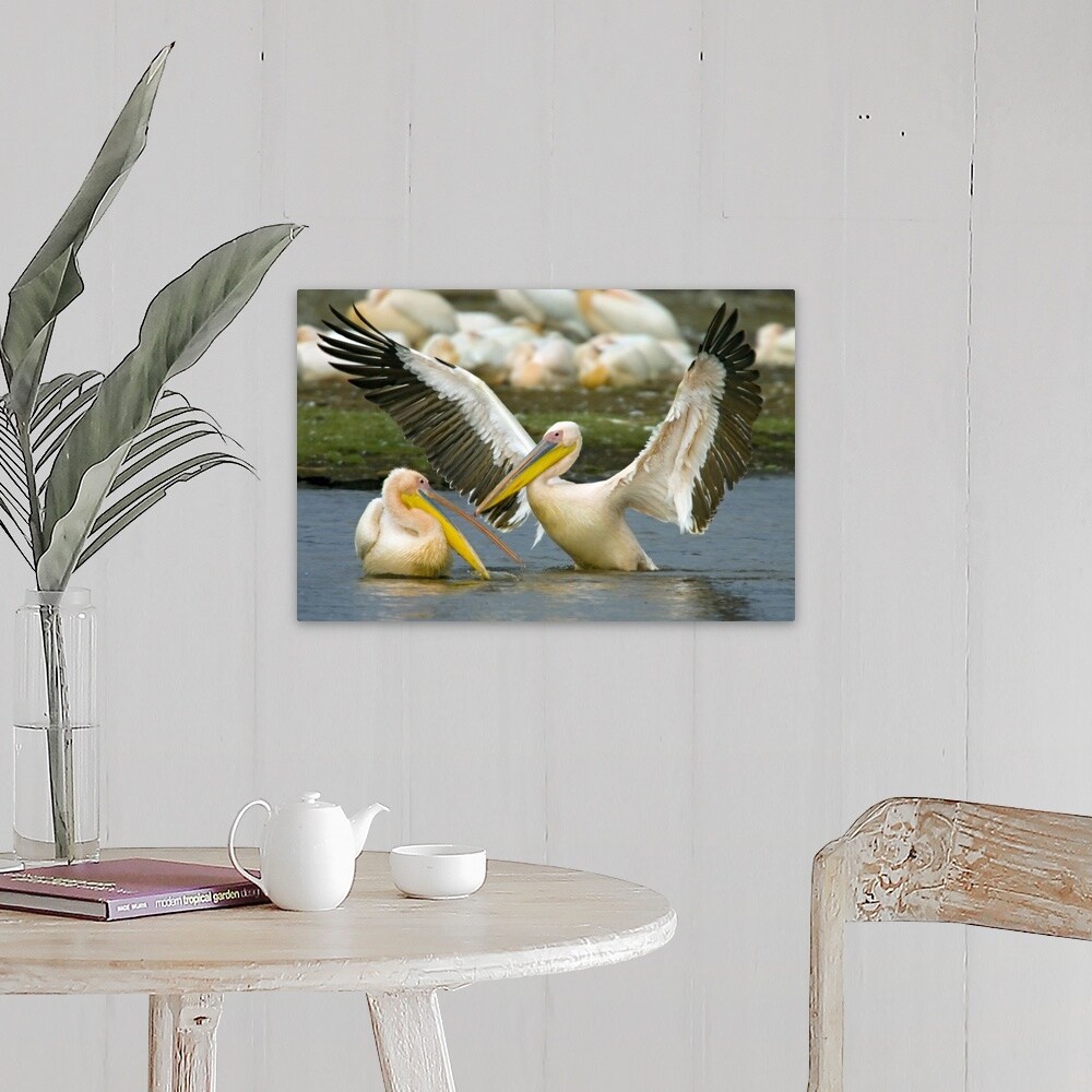 "Two Great white pelicans wading in a lake, Lake Nakuru, Kenya (Pelecanus onocrotalus)" Canvas Wall Art