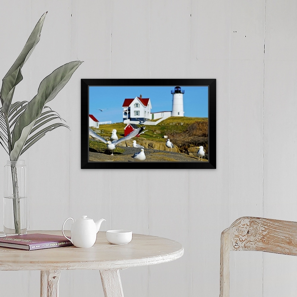 "Seagulls at Nubble Lighthouse, Cape Neddick, York, Maine" Black Framed Print