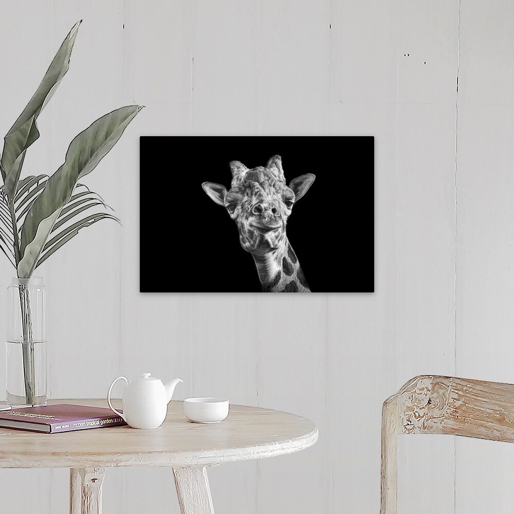 "Giraffe in black and white on an all black background taken at Nashville Zoo." Canvas Wall Art