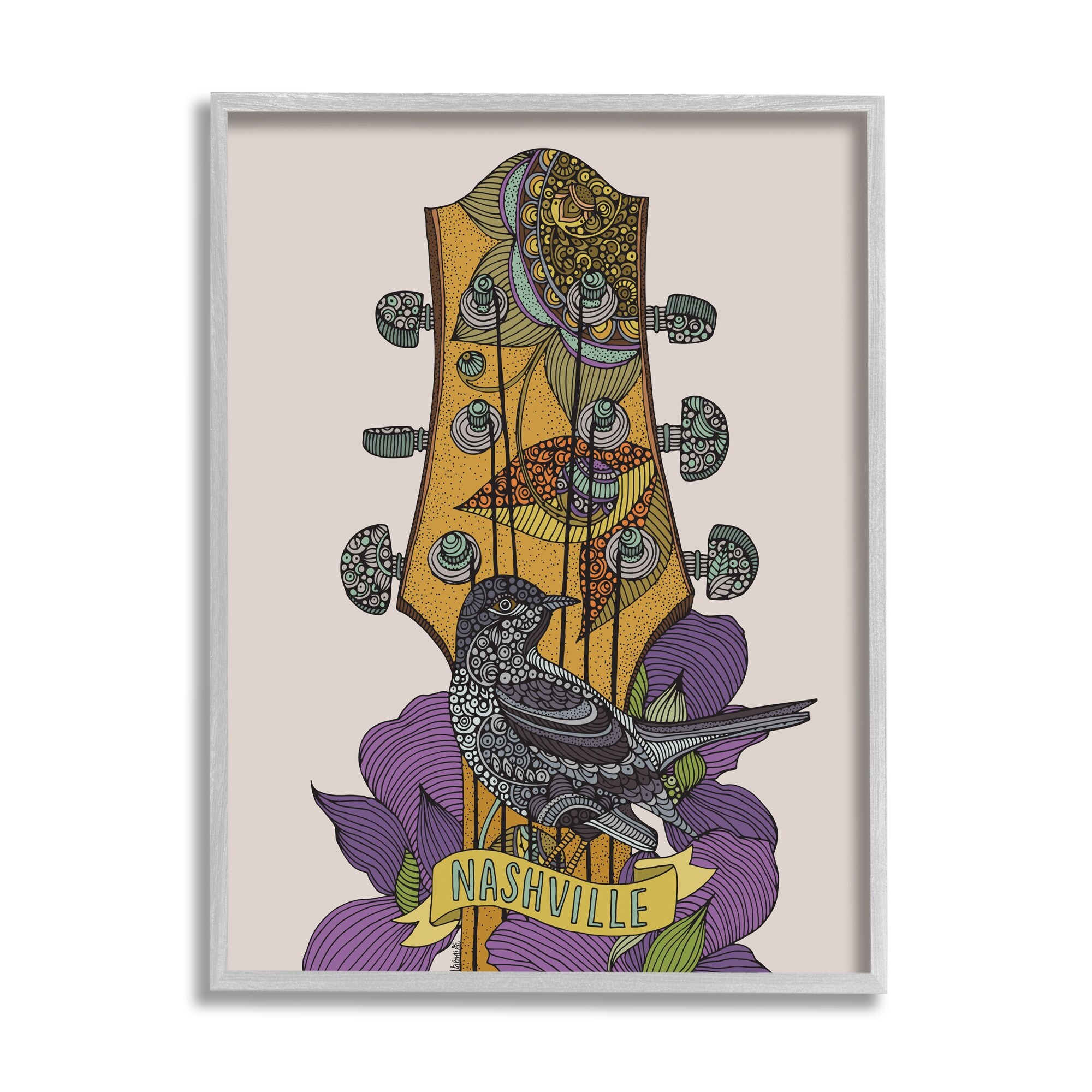 Stupell Intricate Nashville Guitar Floral Patterned Bird Perched Framed Wall Art, Design by Valentina Harper