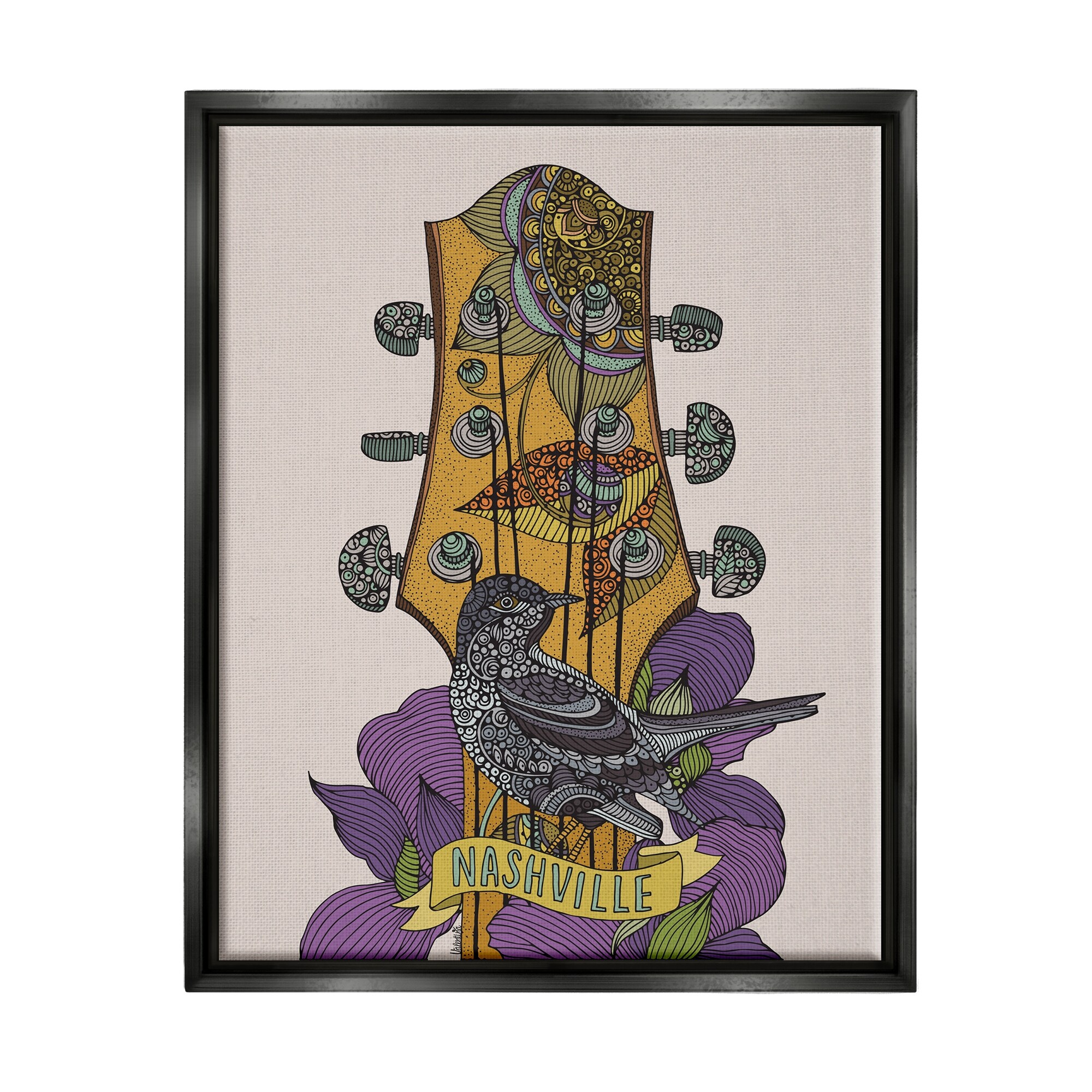 Stupell Industries Intricate Nashville Guitar Floral Patterned Bird Perched Floater Frame, Design by Valentina Harper