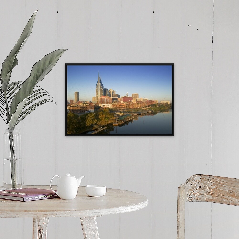 "High angle view of buildings in a city, Cumberland River, Nashville, Tennessee" Black Float Frame Canvas Art
