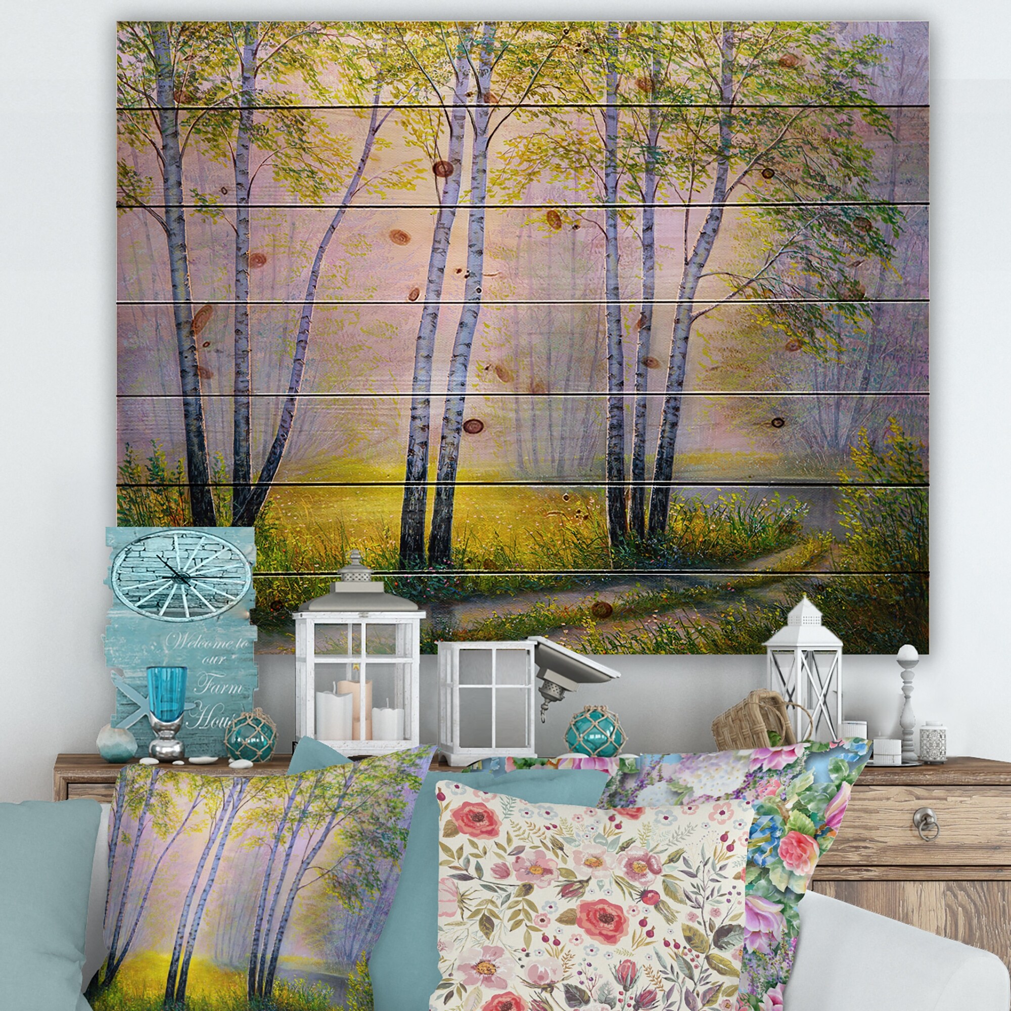 Designart 'Morning Sunlight Through the Birches I' Traditional Print on Natural Pine Wood